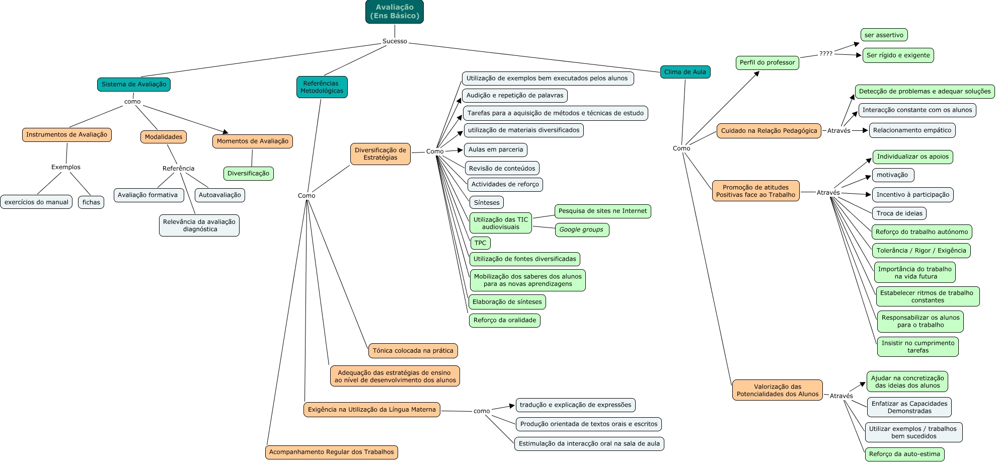 Esse mapa conceitual, produzido no IHMC CmapTools, tem a informação relacionada a: avaliação - 2º P, Valorização das Potencialidades dos Alunos Através Enfatizar as Capacidades Demonstradas, Avaliação (Ens Básico) Sucesso Sistema de Avaliação, Modalidades Referência Relevância da avaliação diagnóstica, Perfil do professor ???? ser assertivo, Diversificação de Estratégias Como Reforço da oralidade, Cuidado na Relação Pedagógica Através Interacção constante com os alunos, Diversificação de Estratégias Como Actividades de reforço, Diversificação de Estratégias Como Elaboração de sínteses, Sistema de Avaliação como Instrumentos de Avaliação, Referências Metodológicas Como Adequação das estratégias de ensino ao nível de desenvolvimento dos alunos, Promoção de atitudes Positivas face ao Trabalho Através Individualizar os apoios, Referências Metodológicas Como Exigência na Utilização da Língua Materna, Diversificação de Estratégias Como Audição e repetição de palavras, Diversificação de Estratégias Como utilização de materiais diversificados, Promoção de atitudes Positivas face ao Trabalho Através Reforço do trabalho autónomo, Promoção de atitudes Positivas face ao Trabalho Através Incentivo à participação, Cuidado na Relação Pedagógica Através Relacionamento empático, Utilização das TIC audiovisuais ???? Pesquisa de sites ne Internet, Promoção de atitudes Positivas face ao Trabalho Através Estabelecer ritmos de trabalho constantes, Diversificação de Estratégias Como Tarefas para a aquisição de métodos e técnicas de estudo