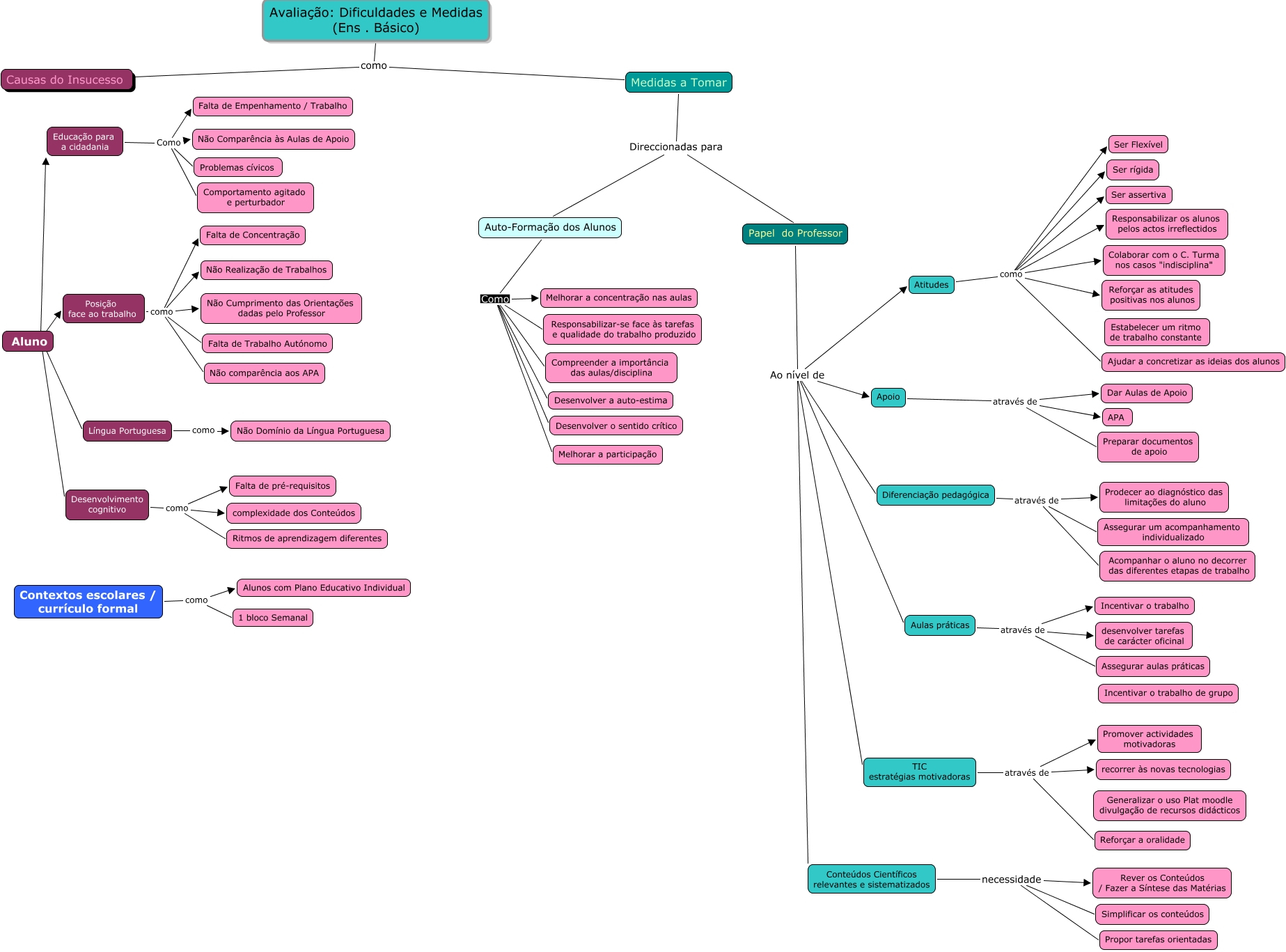 Esse mapa conceitual, produzido no IHMC CmapTools, tem a informação relacionada a: Avaliação Básico - problemas medidas 2ºP (s), Atitudes como Ser assertiva, Desenvolvimento cognitivo como Ritmos de aprendizagem diferentes, Contextos escolares / currículo formal como Alunos com Plano Educativo Individual, Aluno ???? Desenvolvimento cognitivo, Desenvolvimento cognitivo como complexidade dos Conteúdos, Atitudes como Colaborar com o C. Turma nos casos "indisciplina", Educação para a cidadania Como Falta de Empenhamento / Trabalho, Língua Portuguesa como Não Domínio da Língua Portuguesa, Atitudes como Reforçar as atitudes positivas nos alunos, Avaliação: Dificuldades e Medidas (Ens . Básico) como Medidas a Tomar, Papel do Professor Ao nível de Atitudes, Papel do Professor Ao nível de Apoio, Diferenciação pedagógica através de Assegurar um acompanhamento individualizado, Diferenciação pedagógica através de Prodecer ao diagnóstico das limitações do aluno, Avaliação: Dificuldades e Medidas (Ens . Básico) como Causas do Insucesso, Apoio através de Preparar documentos de apoio, Auto-Formação dos Alunos Como Compreender a importância das aulas/disciplina, Auto-Formação dos Alunos Como Responsabilizar-se face às tarefas e qualidade do trabalho produzido, Atitudes como Ajudar a concretizar as ideias dos alunos, Contextos escolares / currículo formal como 1 bloco Semanal