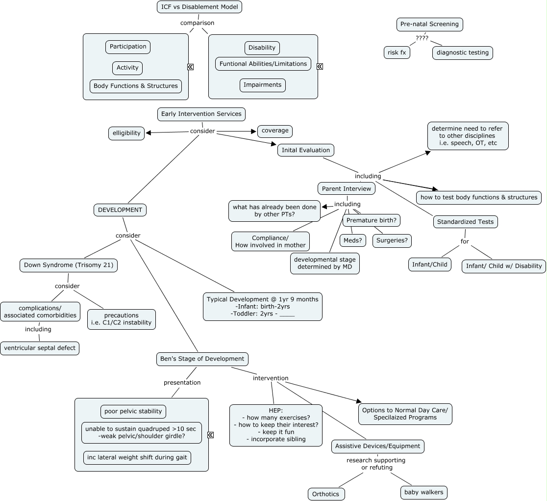 This Concept Map, created with IHMC CmapTools, has information related to: Case 1.1 - Ben Bock, Early Intervention Services consider elligibility, Parent Interview including what has already been done by other PTs?, Early Intervention Services consider DEVELOPMENT, Assistive Devices/Equipment research supporting or refuting baby walkers, Parent Interview including developmental stage determined by MD, Inital Evaluation including Parent Interview, Ben's Stage of Development presentation ????, Pre-natal Screening ???? diagnostic testing, Ben's Stage of Development intervention Assistive Devices/Equipment, Parent Interview including Premature birth?, complications/ associated comorbidities including ventricular septal defect, Parent Interview including Compliance/ How involved in mother, ICF vs Disablement Model comparison ICF, Down Syndrome (Trisomy 21) consider complications/ associated comorbidities, Standardized Tests for Infant/Child, Inital Evaluation including determine need to refer to other disciplines i.e. speech, OT, etc, Down Syndrome (Trisomy 21) consider precautions i.e. C1/C2 instability, Parent Interview including Surgeries?, Inital Evaluation including Standardized Tests, how to test body functions & structures including Parent Interview