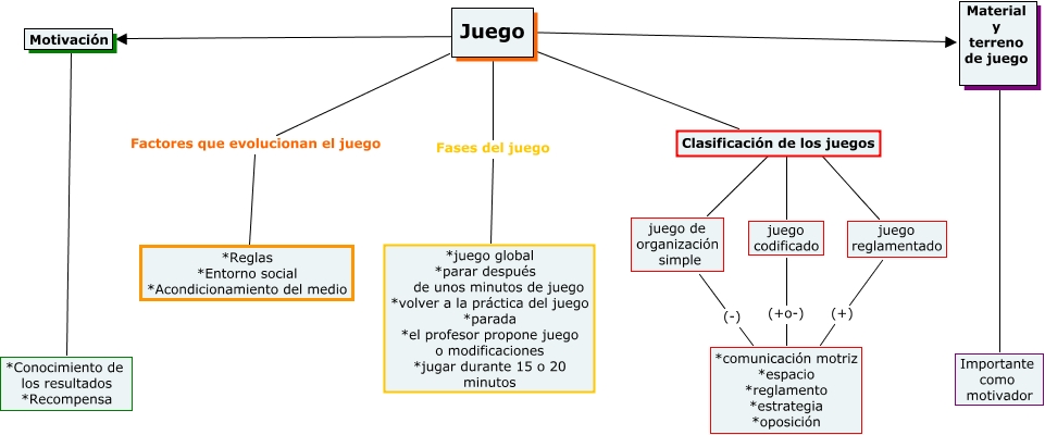 Este Cmap, tiene información relacionada con: Domingo Blázquez Sánchez, Juego ???? Clasificación de los juegos, Clasificación de los juegos ???? juego de organización simple, Juego Fases del juego *juego global *parar después de unos minutos de juego *volver a la práctica del juego *parada *el profesor propone juego o modificaciones *jugar durante 15 o 20 minutos, juego codificado (+o-) *comunicación motriz *espacio *reglamento *estrategia *oposición, Motivación ???? *Conocimiento de los resultados *Recompensa, Juego ???? Material y terreno de juego, juego reglamentado (+) *comunicación motriz *espacio *reglamento *estrategia *oposición, Juego Factores que evolucionan el juego *Reglas *Entorno social *Acondicionamiento del medio, Clasificación de los juegos ???? juego reglamentado, Clasificación de los juegos ???? juego codificado, Juego ???? Motivación, Material y terreno de juego ???? Importante como motivador, juego de organización simple (-) *comunicación motriz *espacio *reglamento *estrategia *oposición