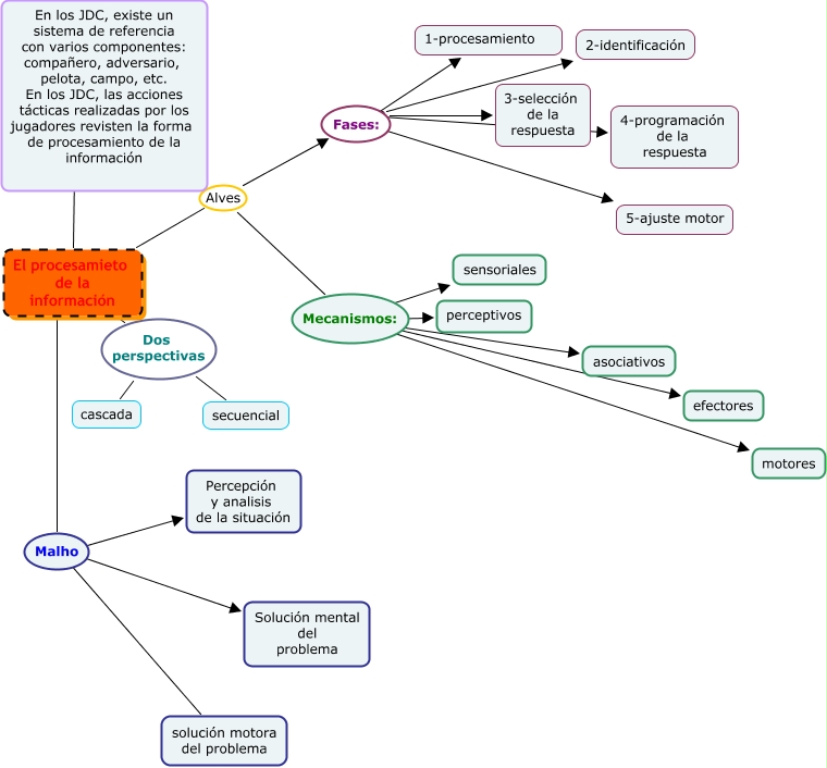 Este Cmap, tiene información relacionada con: El procesamiento de la información-Tavares, Mecanismos: ???? sensoriales, Fases: ???? 2-identificación, El procesamieto de la información Alves Mecanismos:, Fases: ???? 5-ajuste motor, Malho ???? solución motora del problema, Mecanismos: ???? efectores, Malho ???? Solución mental del problema, El procesamieto de la información ???? En los JDC, existe un sistema de referencia con varios componentes: compañero, adversario, pelota, campo, etc. En los JDC, las acciones tácticas realizadas por los jugadores revisten la forma de procesamiento de la información, El procesamieto de la información Dos perspectivas secuencial, Fases: ???? 4-programación de la respuesta, Fases: ???? 3-selección de la respuesta, El procesamieto de la información Dos perspectivas cascada, Mecanismos: ???? asociativos, El procesamieto de la información Alves Fases:, El procesamieto de la información ???? Malho, Mecanismos: ???? motores, Malho ???? Percepción y analisis de la situación, Fases: ???? 1-procesamiento, Mecanismos: ???? perceptivos