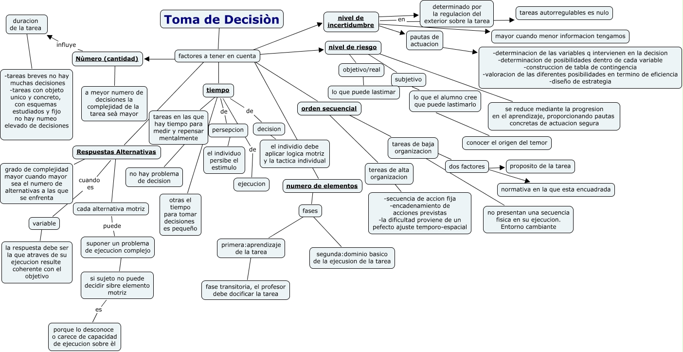 Este Cmap, tiene información relacionada con: Argañaraz,Martinez,Hahn.toma de decis.Sanchez Bañuelos, nivel de riesgo ???? objetivo/real, factores a tener en cuenta ???? Nùmero (cantidad), nivel de incertidumbre ???? pautas de actuacion, tiempo ???? tareas en las que hay tiempo para medir y repensar mentalmente, tiempo ???? otras el tiempo para tomar decisiones es pequeño, orden secuencial ???? tereas de alta organizacion, nivel de riesgo ???? se reduce mediante la progresion en el aprendizaje, proporcionando pautas concretas de actuacion segura, orden secuencial ???? tareas de baja organizacion, factores a tener en cuenta ???? nivel de riesgo, numero de elementos ???? fases, Respuestas Alternativas cuando es variable, factores a tener en cuenta ???? numero de elementos, Respuestas Alternativas ???? cada alternativa motriz, dos factores ???? proposito de la tarea, Nùmero (cantidad) influye duracion de la tarea, Nùmero (cantidad) ???? a meyor numero de decisiones la complejidad de la tarea seà mayor, tiempo de decision, subjetivo ???? lo que el alumno cree que puede lastimarlo, tereas de alta organizacion ???? -secuencia de accion fija -encadenamiento de acciones previstas -la dificultad proviene de un pefecto ajuste temporo-espacial, nivel de incertidumbre ???? mayor cuando menor informacion tengamos