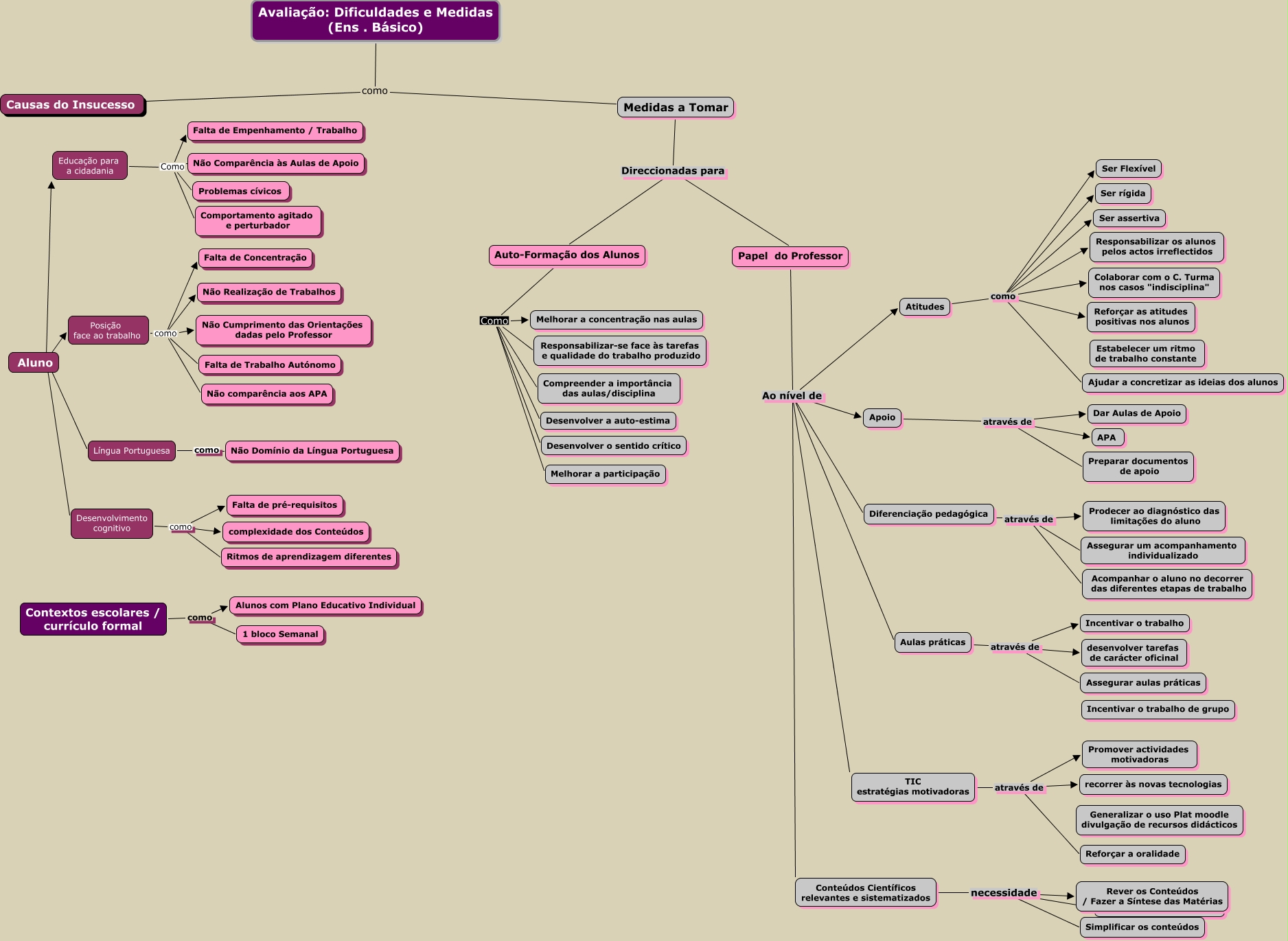 Esse mapa conceitual, produzido no IHMC CmapTools, tem a informação relacionada a: Avaliação - problemas medidas 3ºP (s), Atitudes como Ser assertiva, Desenvolvimento cognitivo como Ritmos de aprendizagem diferentes, Contextos escolares / currículo formal como Alunos com Plano Educativo Individual, Aluno ???? Desenvolvimento cognitivo, Desenvolvimento cognitivo como complexidade dos Conteúdos, Atitudes como Colaborar com o C. Turma nos casos "indisciplina", Educação para a cidadania Como Falta de Empenhamento / Trabalho, Língua Portuguesa como Não Domínio da Língua Portuguesa, Atitudes como Reforçar as atitudes positivas nos alunos, Avaliação: Dificuldades e Medidas (Ens . Básico) como Medidas a Tomar, Papel do Professor Ao nível de Atitudes, Papel do Professor Ao nível de Apoio, Diferenciação pedagógica através de Assegurar um acompanhamento individualizado, Diferenciação pedagógica através de Prodecer ao diagnóstico das limitações do aluno, Avaliação: Dificuldades e Medidas (Ens . Básico) como Causas do Insucesso, Apoio através de Preparar documentos de apoio, Auto-Formação dos Alunos Como Compreender a importância das aulas/disciplina, Auto-Formação dos Alunos Como Responsabilizar-se face às tarefas e qualidade do trabalho produzido, Atitudes como Ajudar a concretizar as ideias dos alunos, Contextos escolares / currículo formal como 1 bloco Semanal