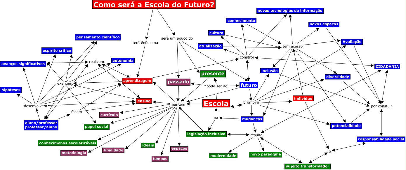 Esse mapa conceitual, produzido no IHMC CmapTools, tem a informação relacionada a: Escola do Futuro, passado mantém aprendizagem, legislação inclusiva mantém currículo, cultura tem acesso Avaliação, passado mantém ensino, CIDADANIA resulta novo paradgma, Escola mantém currículo, legislação inclusiva mantém ensino, conhecimento tem acesso mudanças, passado mantém conhecimenos escolarizáveis, indivíduo tem acesso potencialidade, mudanças na Escola, indivíduo é sujeito transformador, presente mantém finalidade, inclusão por constuir CIDADANIA, Como será a Escola do Futuro? terá ênfase na aprendizagem, futuro promove potencialidade, futuro constrói novas tecnologias da informação, presente mantém conhecimenos escolarizáveis, indivíduo tem acesso mudanças, futuro constrói CIDADANIA