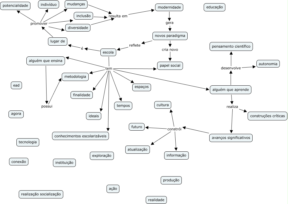 Esse mapa conceitual, produzido no IHMC CmapTools, tem a informação relacionada a: anormais_mara_neuza, escola tem ideais, avanços significativos constrói futuro, escola tem tempos, escola tem espaços, mudanças resulta em modernidade, escola tem alguém que aprende, novos paradigma reflete escola, inclusão resulta em modernidade, novos paradigma cria novo papel social, alguém que aprende desenvolve autonomia, alguém que aprende realiza avanços significativos, alguém que aprende realiza construções críticas, escola tem finalidade, escola tem metodologia, escola é lugar de, alguém que ensina possui metodologia, lugar de promover indivíduo, escola tem conhecimentos escolarizáveis, escola tem papel social, lugar de promover diversidade