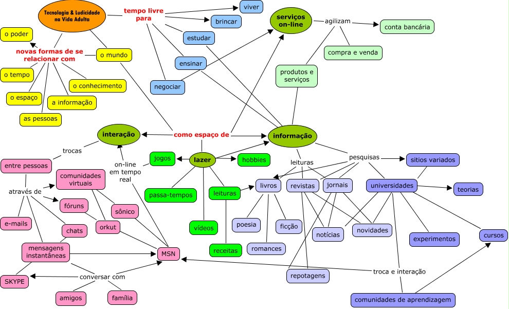Esse mapa conceitual, produzido no IHMC CmapTools, tem a informação relacionada a: tecnologia_adulto, Tecnologia & Ludicidade na Vida Adulta novas formas de se relacionar com o tempo, Tecnologia & Ludicidade na Vida Adulta tempo livre para negociar, mensagens instantâneas conversar com SKYPE, mensagens instantâneas conversar com MSN, lazer ???? jogos, leituras ???? livros, Tecnologia & Ludicidade na Vida Adulta novas formas de se relacionar com o espaço, universidades troca e interação MSN, livros ???? poesia, comunidades virtuais ???? orkut, livros ???? ficção, interação trocas entre pessoas, o mundo novas formas de se relacionar com o poder, revistas ???? repotagens, entre pessoas através de chats, informação leituras livros, universidades ???? experimentos, informação leituras revistas, o mundo novas formas de se relacionar com as pessoas, mensagens instantâneas conversar com amigos