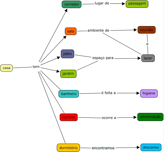Esse mapa conceitual, produzido no IHMC CmapTools, tem a informação relacionada a: Casa, corredor lugar de passagem, casa tem jardim, reunião e lazer, sala ambiente de lazer, dormitório encontramos descanso, cozinha ocorre a alimentação, casa tem corredor, casa tem pátio, casa tem dormitório, casa tem banheiro, pátio espaço para lazer, sala ambiente de reunião, banheiro é feita a higiene, pátio espaço para jardim, casa tem sala, casa tem cozinha