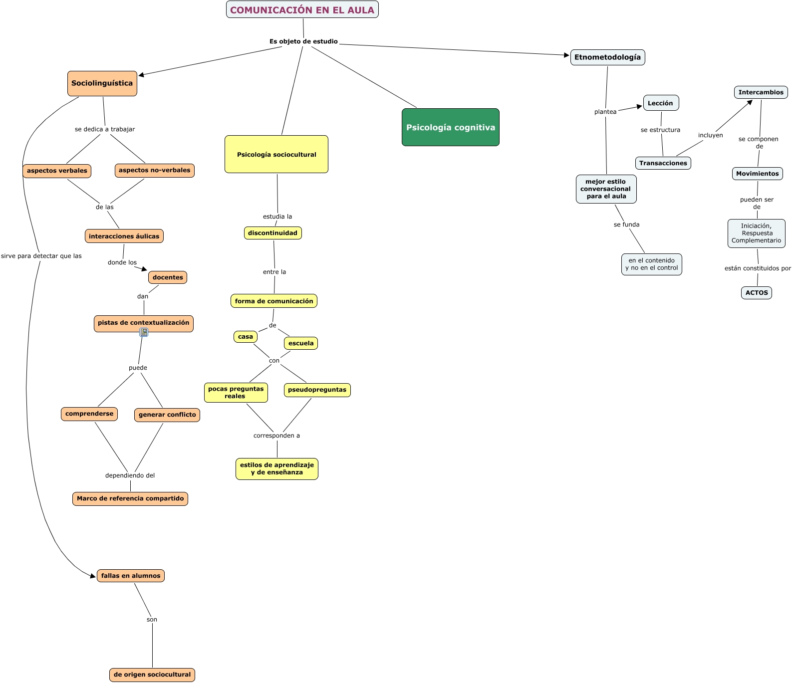 Este mapa conceptual tiene información relacionada a: comunicacion aula, interacciones áulicas donde los docentes, Etnometodología plantea Lección, COMUNICACIÓN EN EL AULA Es objeto de estudio Etnometodología, aspectos verbales de las interacciones áulicas, Iniciación, Respuesta Complementario están constituidos por ACTOS, Psicología sociocultural estudia la discontinuidad, Etnometodología plantea mejor estilo conversacional para el aula, generar conflicto dependiendo del Marco de referencia compartido, fallas en alumnos son de origen sociocultural, forma de comunicación de casa