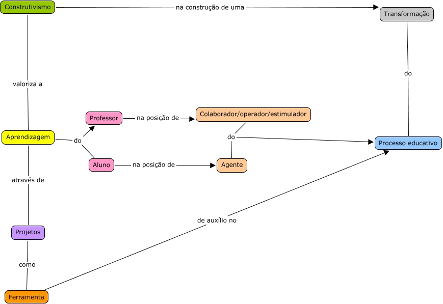 Esse mapa conceitual, produzido no IHMC CmapTools, tem a informação relacionada a: Projetos, Transformação do Processo educativo, Construtivismo valoriza a Aprendizagem, Aprendizagem através de Projetos, Construtivismo na construção de uma Transformação, Aprendizagem do Aluno, Projetos como Ferramenta, Colaborador/operador/estimulador do Processo educativo, Professor na posição de Colaborador/operador/estimulador, Ferramenta de auxílio no Processo educativo, Aluno na posição de Agente, Colaborador/operador/estimulador do Agente, Aprendizagem do Professor