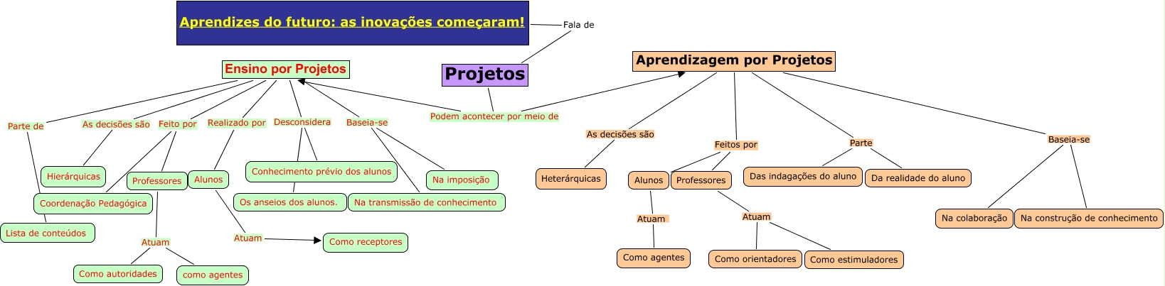 Esse mapa conceitual, produzido no IHMC CmapTools, tem a informação relacionada a: Mapa - Texto Aprender - Grupo Isis e Daniela, Aprendizes do futuro: as inovações começaram! Fala de Projetos, Ensino por Projetos Baseia-se Na transmissão de conhecimento, Aprendizagem por Projetos As decisões são Heterárquicas, Professores Atuam como agentes, Professores Atuam Como estimuladores, Ensino por Projetos Parte de Lista de conteúdos, Ensino por Projetos Realizado por Alunos, Ensino por Projetos As decisões são Hierárquicas, Aprendizagem por Projetos Feitos por Alunos, Ensino por Projetos Desconsidera Conhecimento prévio dos alunos, Aprendizagem por Projetos Feitos por Professores, Ensino por Projetos Baseia-se Na imposição, Aprendizagem por Projetos Parte Das indagações do aluno, Ensino por Projetos Desconsidera Os anseios dos alunos., Ensino por Projetos Feito por Coordenação Pedagógica, Projetos Podem acontecer por meio de Aprendizagem por Projetos, Aprendizagem por Projetos Baseia-se Na colaboração, Projetos Podem acontecer por meio de Ensino por Projetos, Ensino por Projetos Feito por Professores, Professores Atuam Como orientadores
