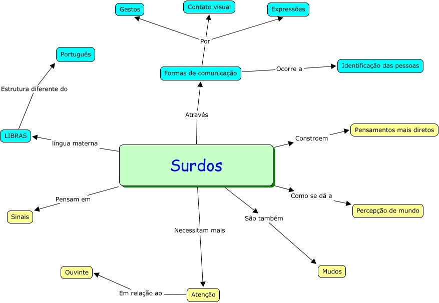 Esse mapa conceitual, produzido no IHMC CmapTools, tem a informação relacionada a: Mapa1_pasurdos, Surdos Pensam em Sinais, Surdos Constroem Pensamentos mais diretos, Surdos Necessitam mais Atenção, Formas de comunicação Ocorre a Identificação das pessoas, Formas de comunicação Por Gestos, Atenção Em relação ao Ouvinte, Formas de comunicação Por Expressões, Surdos São também Mudos, Surdos língua materna LIBRAS, Surdos Como se dá a Percepção de mundo, Surdos Através Formas de comunicação, LIBRAS Estrutura diferente do Português, Formas de comunicação Por Contato visual