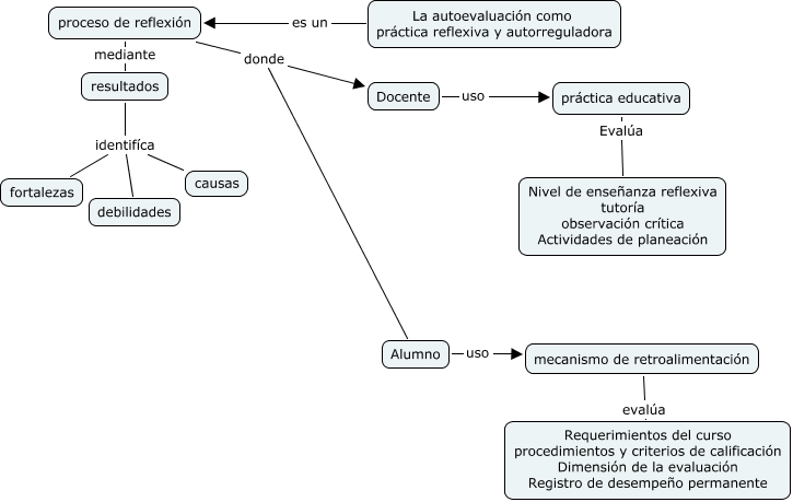 Este Cmap, tiene información relacionada con: 5.7 Autoevaluación, Docente uso práctica educativa, mecanismo de retroalimentación evalúa Requerimientos del curso procedimientos y criterios de calificación Dimensión de la evaluación Registro de desempeño permanente, proceso de reflexión mediante resultados, Alumno uso mecanismo de retroalimentación, resultados identifíca debilidades, resultados identifíca causas, proceso de reflexión donde Docente, práctica educativa Evalúa Nivel de enseñanza reflexiva tutoría observación crítica Actividades de planeación, La autoevaluación como práctica reflexiva y autorreguladora es un proceso de reflexión, resultados identifíca fortalezas, proceso de reflexión donde Alumno
