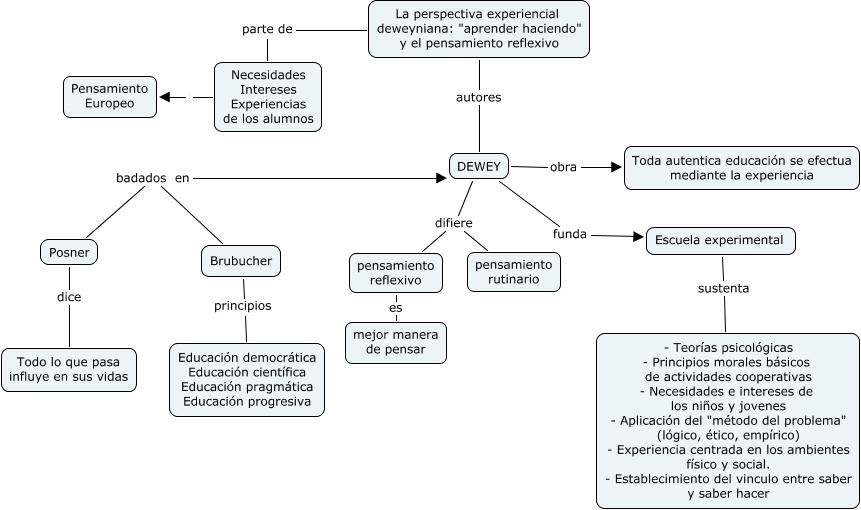 Este Cmap, tiene información relacionada con: Copia (2) de 1.1 Aprender haciendo, Brubucher principios Educación democrática Educación científica Educación pragmática Educación progresiva, DEWEY obra Toda autentica educación se efectua mediante la experiencia, Necesidades Intereses Experiencias de los alumnos Pensamiento Europeo, La perspectiva experiencial deweyniana: "aprender haciendo" y el pensamiento reflexivo parte de Necesidades Intereses Experiencias de los alumnos, DEWEY difiere pensamiento rutinario, DEWEY funda Escuela experimental, La perspectiva experiencial deweyniana: "aprender haciendo" y el pensamiento reflexivo autores DEWEY, pensamiento reflexivo es mejor manera de pensar, Posner badados en DEWEY, Brubucher badados en DEWEY, Posner dice Todo lo que pasa influye en sus vidas, Escuela experimental sustenta - Teorías psicológicas - Principios morales básicos de actividades cooperativas - Necesidades e intereses de los niños y jovenes - Aplicación del "método del problema" (lógico, ético, empírico) - Experiencia centrada en los ambientes físico y social. - Establecimiento del vinculo entre saber y saber hacer, DEWEY difiere pensamiento reflexivo