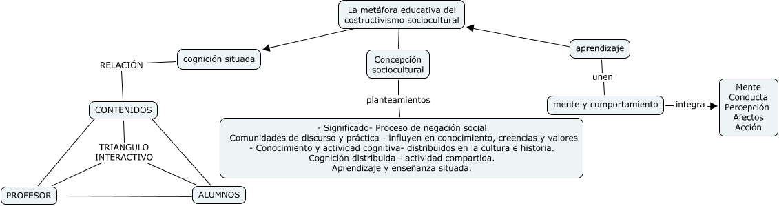 Este Cmap, tiene información relacionada con: 1.3 Metáfora educativa, cognición situada RELACIÓN CONTENIDOS, Concepción sociocultural planteamientos - Significado- Proceso de negación social -Comunidades de discurso y práctica - influyen en conocimiento, creencias y valores - Conocimiento y actividad cognitiva- distribuidos en la cultura e historia. Cognición distribuida - actividad compartida. Aprendizaje y enseñanza situada., mente y comportamiento integra Mente Conducta Percepción Afectos Acción, PROFESOR ???? ALUMNOS, aprendizaje ???? La metáfora educativa del costructivismo sociocultural, PROFESOR ???? CONTENIDOS, La metáfora educativa del costructivismo sociocultural ???? cognición situada, CONTENIDOS TRIANGULO INTERACTIVO PROFESOR, aprendizaje unen mente y comportamiento, CONTENIDOS TRIANGULO INTERACTIVO ALUMNOS, CONTENIDOS ???? ALUMNOS, La metáfora educativa del costructivismo sociocultural ???? Concepción sociocultural