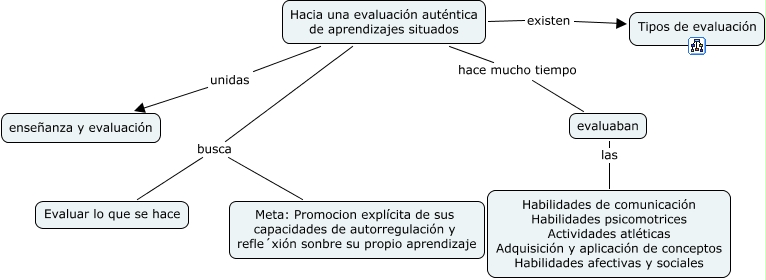 Este Cmap, tiene información relacionada con: 5.1 Evaluacion Autentica, Hacia una evaluación auténtica de aprendizajes situados busca Meta: Promocion explícita de sus capacidades de autorregulación y refle´xión sonbre su propio aprendizaje, Hacia una evaluación auténtica de aprendizajes situados unidas enseñanza y evaluación, evaluaban las Habilidades de comunicación Habilidades psicomotrices Actividades atléticas Adquisición y aplicación de conceptos Habilidades afectivas y sociales, Hacia una evaluación auténtica de aprendizajes situados existen Tipos de evaluación, Hacia una evaluación auténtica de aprendizajes situados hace mucho tiempo evaluaban, Hacia una evaluación auténtica de aprendizajes situados busca Evaluar lo que se hace