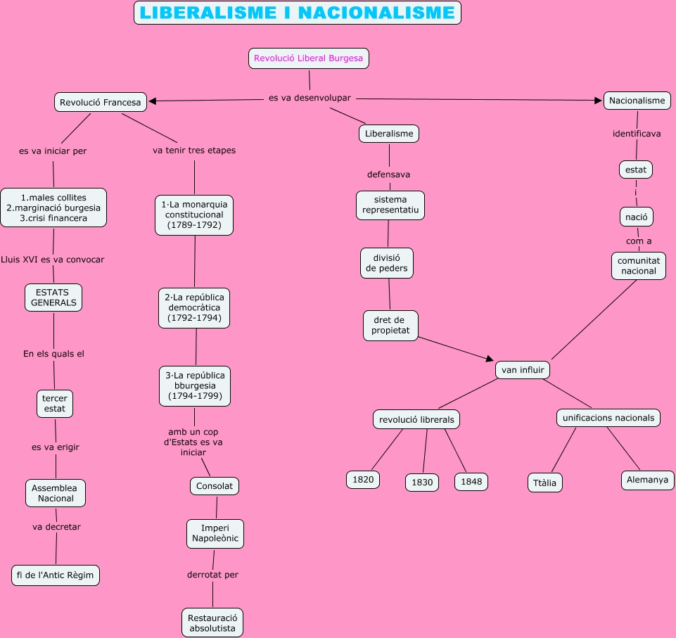 Aquest mapa conceptual conté informació relacionada amb: liberalisme i nacionalisme, estat i nació, Nacionalisme identificava estat, Assemblea Nacional va decretar fi de l'Antic Règim, 1.males collites 2.marginació burgesia 3.crisi financera Lluis XVI es va convocar ESTATS GENERALS, revolució librerals ???? 1820, dret de propietat ???? van influir, sistema representatiu .. divisió de peders, divisió de peders ???? dret de propietat, 1·La monarquia constitucional (1789-1792) ???? 2·La república democràtica (1792-1794), nació com a comunitat nacional, comunitat nacional ???? van influir, 3·La república bburgesia (1794-1799) amb un cop d'Estats es va iniciar Consolat, 2·La república democràtica (1792-1794) ???? 3·La república bburgesia (1794-1799), ESTATS GENERALS En els quals el tercer estat, revolució librerals ???? 1830, van influir ???? unificacions nacionals, Revolució Liberal Burgesa es va desenvolupar Liberalisme, revolució librerals ???? 1848, Revolució Liberal Burgesa es va desenvolupar Nacionalisme, Imperi Napoleònic derrotat per Restauració absolutista