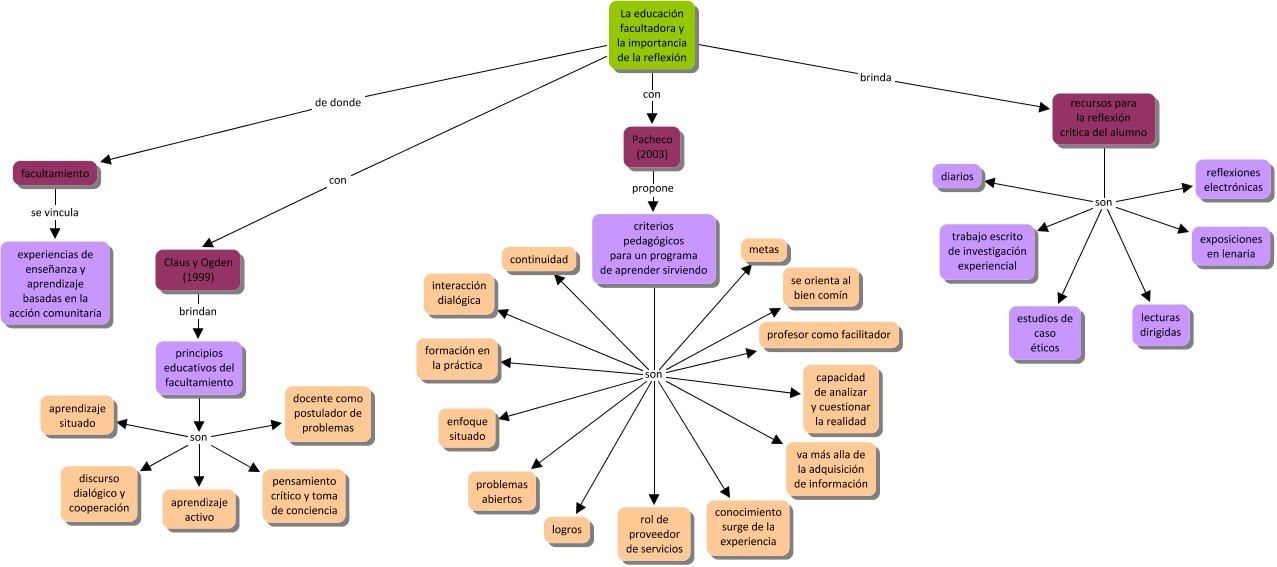 Este Cmap, tiene información relacionada con: EDUCACIÓN, recursos para la reflexión crítica del alumno son exposiciones en lenaria, principios educativos del facultamiento son aprendizaje situado, principios educativos del facultamiento son aprendizaje activo, criterios pedagógicos para un programa de aprender sirviendo son metas, La educación facultadora y la importancia de la reflexión de donde facultamiento, criterios pedagógicos para un programa de aprender sirviendo son rol de proveedor de servicios, La educación facultadora y la importancia de la reflexión con Pacheco (2003), principios educativos del facultamiento son docente como postulador de problemas, principios educativos del facultamiento son pensamiento crítico y toma de conciencia, recursos para la reflexión crítica del alumno son lecturas dirigidas, criterios pedagógicos para un programa de aprender sirviendo son problemas abiertos, criterios pedagógicos para un programa de aprender sirviendo son profesor como facilitador, criterios pedagógicos para un programa de aprender sirviendo son formación en la práctica, La educación facultadora y la importancia de la reflexión con Claus y Ogden (1999), criterios pedagógicos para un programa de aprender sirviendo son enfoque situado, recursos para la reflexión crítica del alumno son estudios de caso éticos, Claus y Ogden (1999) brindan principios educativos del facultamiento, facultamiento se vincula experiencias de enseñanza y aprendizaje basadas en la acción comunitaria, criterios pedagógicos para un programa de aprender sirviendo son conocimiento surge de la experiencia, principios educativos del facultamiento son discurso dialógico y cooperación