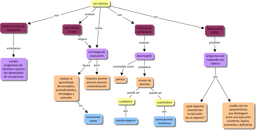 Este Cmap, tiene información relacionada con: RÚBRICAS, niveles de dominio puede ser cuantitativo, cualitativo son novato-experto, Las rúbricas como estrategia de evaluación, guías o escalas de evaluación establecen niveles progresivos de dominio o pericia del desempeño de una persona, Las rúbricas evalúan aprendizaje situado, preguntas que responde una rúbrica son ¿qué aspectos caracterizan la ejecución de un experto?, cuantitativo son puntuaciones numéricas, Las rúbricas con Montecinos (2003), evaluar el aprendizaje de conceptos, procedimientos, estratégias y actitudes en situaciones reales, estrategia de evaluación busca evaluar el aprendizaje de conceptos, procedimientos, estratégias y actitudes, estrategia de evaluación para maestro-alumno alumno-alumno autoevaluación, aprendizaje situado reqiere estrategia de evaluación, Las rúbricas son matrices de verificación, desempeño establece niveles de dominio, niveles de dominio puede ser cualitativo, Montecinos (2003) propone preguntas que responde una rúbrica, matrices de verificación evalúan desempeño, preguntas que responde una rúbrica son ¿cuáles son las características que disitinguen entre una ejecución excelente, buena, promedio y deficiente, desempeño entendido como pericia, Las rúbricas son guías o escalas de evaluación
