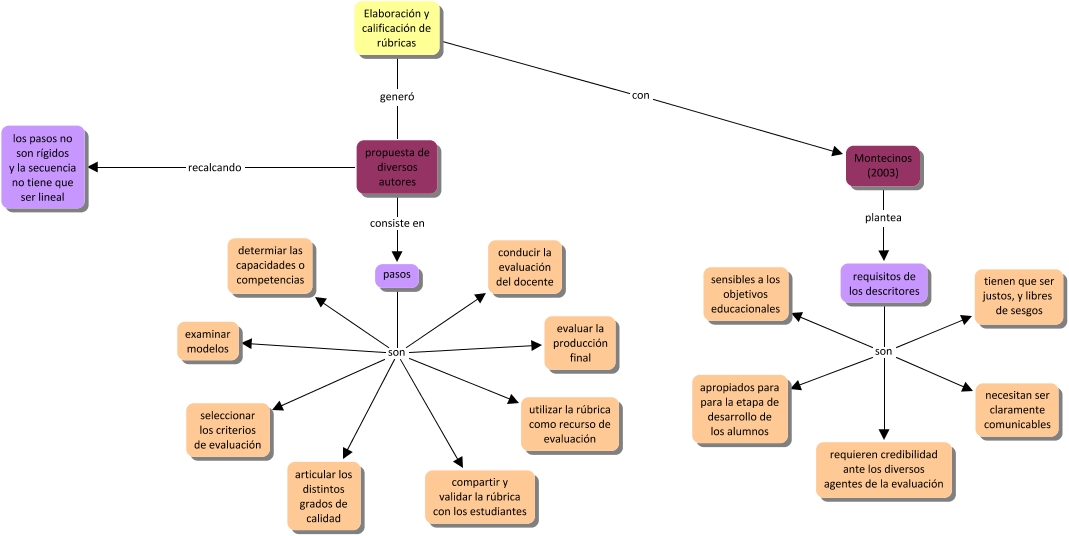 Este Cmap, tiene información relacionada con: ELABORACIÓN, requisitos de los descritores son apropiados para para la etapa de desarrollo de los alumnos, propuesta de diversos autores consiste en pasos, requisitos de los descritores son tienen que ser justos, y libres de sesgos, propuesta de diversos autores recalcando los pasos no son rígidos y la secuencia no tiene que ser lineal, Elaboración y calificación de rúbricas generó propuesta de diversos autores, pasos son compartir y validar la rúbrica con los estudiantes, pasos son utilizar la rúbrica como recurso de evaluación, pasos son conducir la evaluación del docente, requisitos de los descritores son requieren credibilidad ante los diversos agentes de la evaluación, Montecinos (2003) plantea requisitos de los descritores, pasos son articular los distintos grados de calidad, pasos son examinar modelos, requisitos de los descritores son sensibles a los objetivos educacionales, pasos son evaluar la producción final, pasos son determiar las capacidades o competencias, Elaboración y calificación de rúbricas con Montecinos (2003), pasos son seleccionar los criterios de evaluación, requisitos de los descritores son necesitan ser claramente comunicables