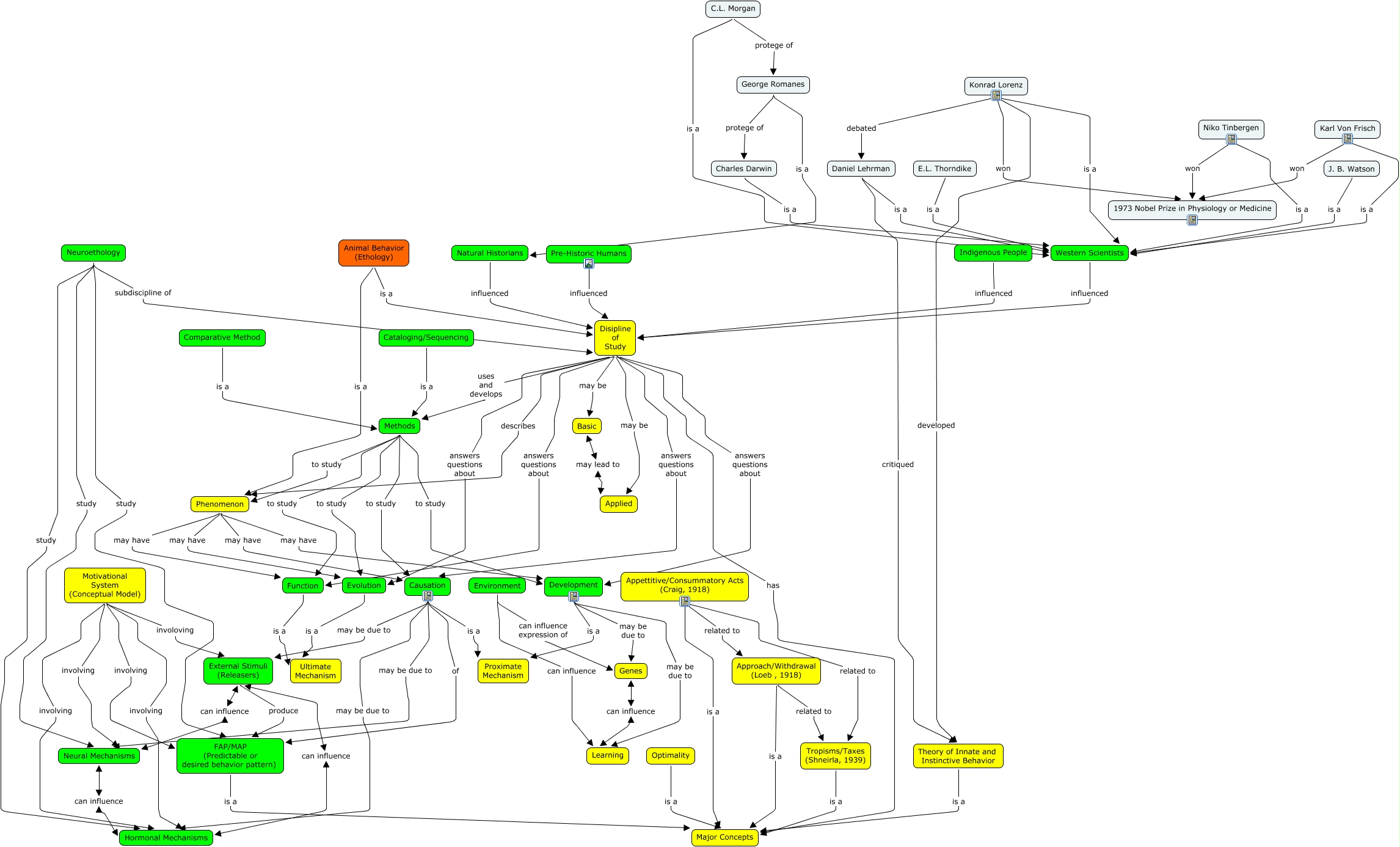 This Concept Map, created with IHMC CmapTools, has information related to: Animal Behavior, Evolution is a Ultimate Mechanism, Neuroethology study Neural Mechanisms, Disipline of Study describes Phenomenon, Konrad Lorenz developed Theory of Innate and Instinctive Behavior, E.L. Thorndike is a Western Scientists, Cataloging/Sequencing is a Methods, Environment can influence expression of Genes, C.L. Morgan is a Western Scientists, Charles Darwin is a Western Scientists, Disipline of Study answers questions about Evolution, Niko Tinbergen won 1973 Nobel Prize in Physiology or Medicine, George Romanes is a Natural Historians, Function is a Ultimate Mechanism, Animal Behavior (Ethology) is a Phenomenon, Motivational System (Conceptual Model) involving FAP/MAP (Predictable or desired behavior pattern), Disipline of Study uses and develops Methods, Indigenous People influenced Disipline of Study, Niko Tinbergen is a Western Scientists, Neuroethology subdiscipline of Disipline of Study, Phenomenon may have Development