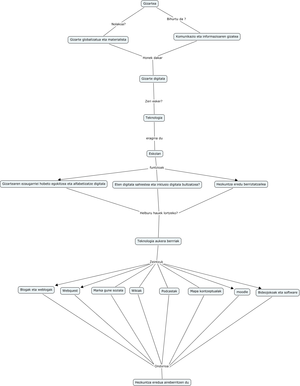 This Concept Map has information related to: aimar, Gizarte globalizatua eta materialista Honek dakar Gizarte digitala, Teknologia aukera berrriak Zeintzuk Marka gune soziala, Wikiak Ondorioa Hezkuntza eredua aireberritzen du, Webquest Ondorioa Hezkuntza eredua aireberritzen du, Gizarte digitala Zeri esker? Teknologia, Teknologia aukera berrriak Zeintzuk Wikiak, Teknologia aukera berrriak Zeintzuk Podcastak, Podcastak Ondorioa Hezkuntza eredua aireberritzen du, Eskolan funtzioak Eten digitala sahiestea eta inklusio digitala bultzatzea?, Gizartearen ezaugarriei hobeto egokitzea eta alfabetizatze digitala Helburu hauek lortzeko? Teknologia aukera berrriak