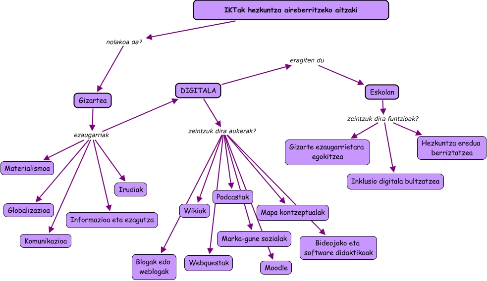 This Concept Map has information related to: lohitzune, DIGITALA zeintzuk dira aukerak? Wikiak, Gizartea ezaugarriak Informazioa eta ezagutza, Eskolan zeintzuk dira funtzioak? Hezkuntza eredua berriztatzea, Gizartea ezaugarriak Globalizazioa, Gizartea ezaugarriak Materialismoa, DIGITALA zeintzuk dira aukerak? Moodle, DIGITALA eragiten du Eskolan, Gizartea ezaugarriak Komunikazioa, DIGITALA zeintzuk dira aukerak? Bideojoko eta software didaktikoak, Gizartea ezaugarriak DIGITALA