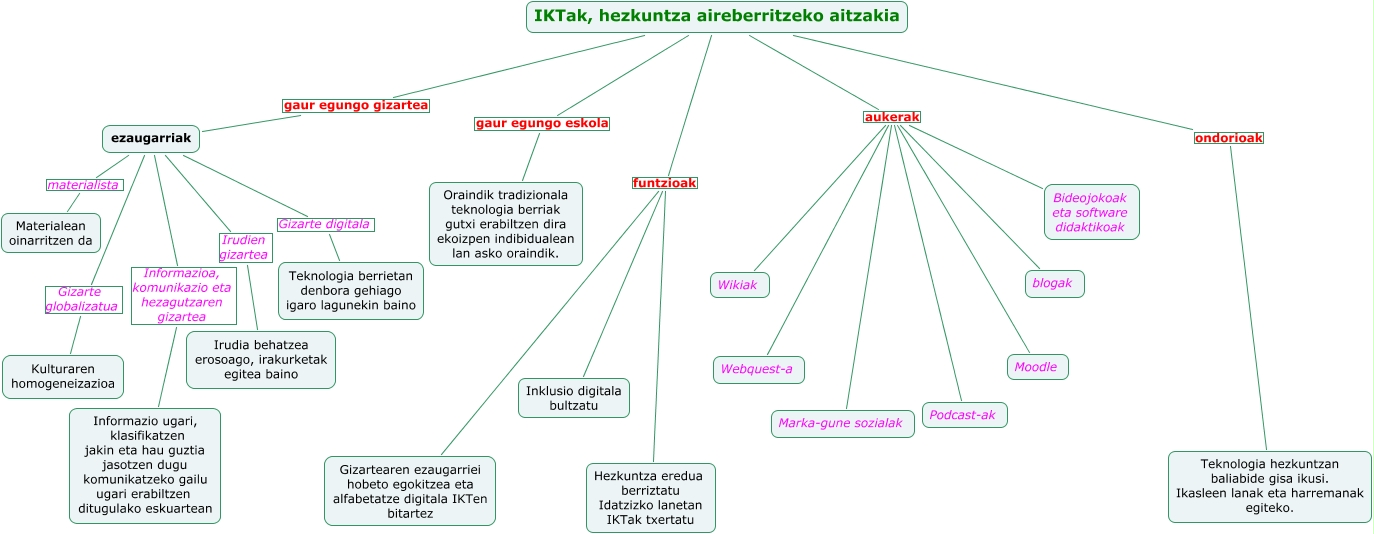 Este Cmap, tiene información relacionada con: etor larranaga, IKTak, hezkuntza aireberritzeko aitzakia gaur egungo eskola Oraindik tradizionala teknologia berriak gutxi erabiltzen dira ekoizpen indibidualean lan asko oraindik., IKTak, hezkuntza aireberritzeko aitzakia funtzioak Gizartearen ezaugarriei hobeto egokitzea eta alfabetatze digitala IKTen bitartez, IKTak, hezkuntza aireberritzeko aitzakia aukerak Podcast-ak, ezaugarriak Gizarte digitala Teknologia berrietan denbora gehiago igaro lagunekin baino, IKTak, hezkuntza aireberritzeko aitzakia ondorioak Teknologia hezkuntzan baliabide gisa ikusi. Ikasleen lanak eta harremanak egiteko., IKTak, hezkuntza aireberritzeko aitzakia aukerak Moodle, IKTak, hezkuntza aireberritzeko aitzakia gaur egungo gizartea ezaugarriak, ezaugarriak Informazioa, komunikazio eta hezagutzaren gizartea Informazio ugari, klasifikatzen jakin eta hau guztia jasotzen dugu komunikatzeko gailu ugari erabiltzen ditugulako eskuartean, IKTak, hezkuntza aireberritzeko aitzakia aukerak Wikiak, ezaugarriak Irudien gizartea Irudia behatzea erosoago, irakurketak egitea baino, IKTak, hezkuntza aireberritzeko aitzakia aukerak blogak, ezaugarriak Gizarte globalizatua Kulturaren homogeneizazioa, IKTak, hezkuntza aireberritzeko aitzakia aukerak Marka-gune sozialak, ezaugarriak materialista Materialean oinarritzen da, IKTak, hezkuntza aireberritzeko aitzakia aukerak Webquest-a, IKTak, hezkuntza aireberritzeko aitzakia aukerak Bideojokoak eta software didaktikoak, IKTak, hezkuntza aireberritzeko aitzakia funtzioak Hezkuntza eredua berriztatu Idatzizko lanetan IKTak txertatu, IKTak, hezkuntza aireberritzeko aitzakia funtzioak Inklusio digitala bultzatu