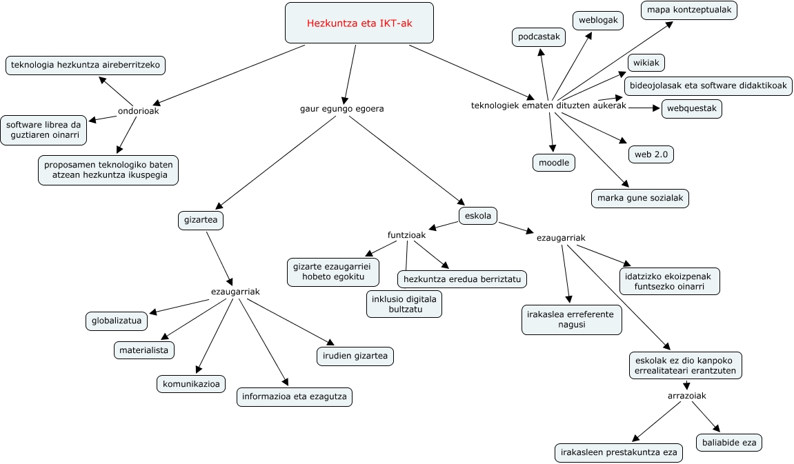 IHMC CmapTools-ekin sortu den kontzeptu-mapa honek honi buruzko informazioa du: beñat barainka, eskolak ez dio kanpoko errealitateari erantzuten arrazoiak irakasleen prestakuntza eza, gizartea ezaugarriak irudien gizartea, gizartea ezaugarriak komunikazioa, Hezkuntza eta IKT-ak ondorioak software librea da guztiaren oinarri, Hezkuntza eta IKT-ak teknologiek ematen dituzten aukerak web 2.0, Hezkuntza eta IKT-ak gaur egungo egoera gizartea, eskolak ez dio kanpoko errealitateari erantzuten arrazoiak baliabide eza, Hezkuntza eta IKT-ak teknologiek ematen dituzten aukerak mapa kontzeptualak, gizartea ezaugarriak informazioa eta ezagutza, Hezkuntza eta IKT-ak teknologiek ematen dituzten aukerak wikiak, Hezkuntza eta IKT-ak teknologiek ematen dituzten aukerak webquestak, eskola funtzioak hezkuntza eredua berriztatu, Hezkuntza eta IKT-ak teknologiek ematen dituzten aukerak podcastak, eskola funtzioak gizarte ezaugarriei hobeto egokitu, eskola ezaugarriak idatzizko ekoizpenak funtsezko oinarri, Hezkuntza eta IKT-ak teknologiek ematen dituzten aukerak bideojolasak eta software didaktikoak, Hezkuntza eta IKT-ak ondorioak teknologia hezkuntza aireberritzeko, gizartea ezaugarriak materialista, eskola ezaugarriak irakaslea erreferente nagusi, gizartea ezaugarriak globalizatua