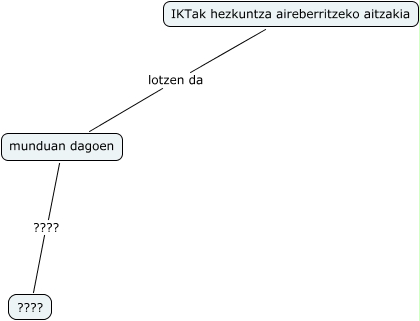 This Concept Map has information related to: jon gorostiza (lehen mapa kontzeptuala), munduan dagoen ???? ????, IKTak hezkuntza aireberritzeko aitzakia lotzen da munduan dagoen