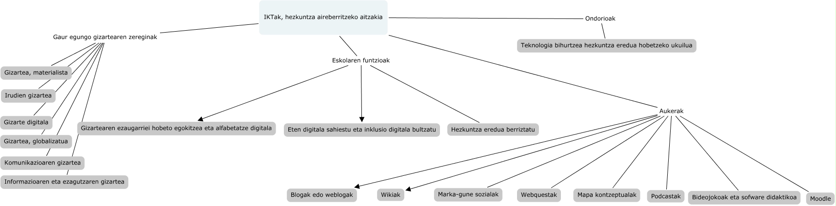 This Concept Map has information related to: Alazne, IKTak, hezkuntza aireberritzeko aitzakia Aukerak Bideojokoak eta sofware didaktikoa, IKTak, hezkuntza aireberritzeko aitzakia Eskolaren funtzioak Eten digitala sahiestu eta inklusio digitala bultzatu, IKTak, hezkuntza aireberritzeko aitzakia Eskolaren funtzioak Gizartearen ezaugarriei hobeto egokitzea eta alfabetatze digitala, IKTak, hezkuntza aireberritzeko aitzakia Aukerak Wikiak, IKTak, hezkuntza aireberritzeko aitzakia Aukerak Mapa kontzeptualak, IKTak, hezkuntza aireberritzeko aitzakia Gaur egungo gizartearen zereginak Gizartea, globalizatua, IKTak, hezkuntza aireberritzeko aitzakia Gaur egungo gizartearen zereginak Gizarte digitala, IKTak, hezkuntza aireberritzeko aitzakia Aukerak Marka-gune sozialak, IKTak, hezkuntza aireberritzeko aitzakia Eskolaren funtzioak Hezkuntza eredua berriztatu, IKTak, hezkuntza aireberritzeko aitzakia Aukerak Webquestak
