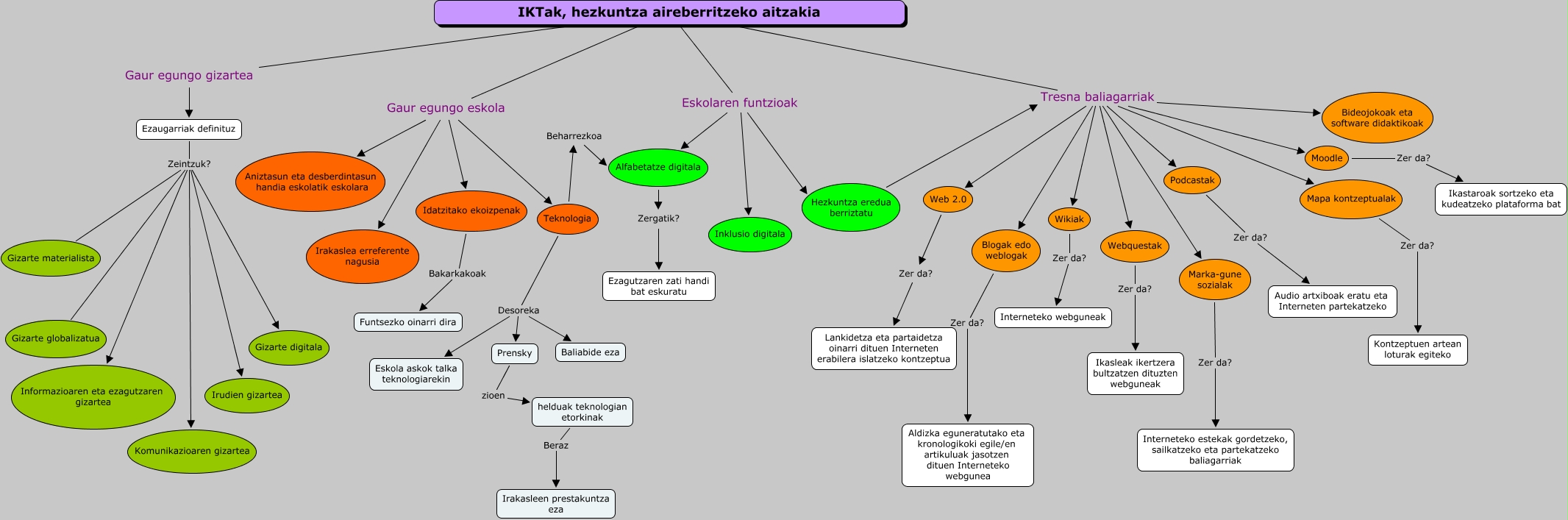 This Concept Map has information related to: lorea mapa, IKTak, hezkuntza aireberritzeko aitzakia Gaur egungo eskola Idatzitako ekoizpenak, IKTak, hezkuntza aireberritzeko aitzakia Gaur egungo eskola Irakaslea erreferente nagusia, Teknologia Desoreka Baliabide eza, IKTak, hezkuntza aireberritzeko aitzakia Gaur egungo eskola Aniztasun eta desberdintasun handia eskolatik eskolara, IKTak, hezkuntza aireberritzeko aitzakia Tresna baliagarriak Webquestak, Hezkuntza eredua berriztatu Tresna baliagarriak Blogak edo weblogak, Ezaugarriak definituz Zeintzuk? Irudien gizartea, Hezkuntza eredua berriztatu Tresna baliagarriak Marka-gune sozialak, Blogak edo weblogak Zer da? Aldizka eguneratutako eta kronologikoki egile/en artikuluak jasotzen dituen Interneteko webgunea, Wikiak Zer da? Interneteko webguneak