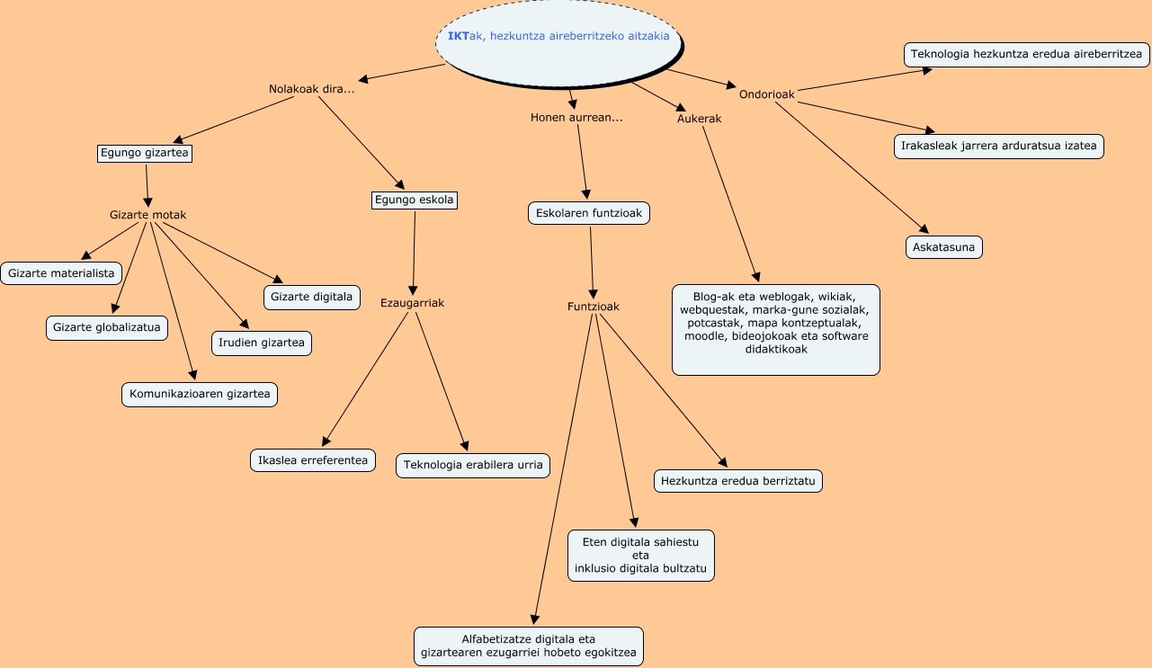 This Concept Map has information related to: mikel martinez, IKTak, hezkuntza aireberritzeko aitzakia Ondorioak Teknologia hezkuntza eredua aireberritzea, Egungo gizartea Gizarte motak Irudien gizartea, IKTak, hezkuntza aireberritzeko aitzakia Ondorioak Irakasleak jarrera arduratsua izatea, Egungo gizartea Gizarte motak Komunikazioaren gizartea, Egungo gizartea Gizarte motak Gizarte materialista, IKTak, hezkuntza aireberritzeko aitzakia Nolakoak dira... Egungo gizartea, Eskolaren funtzioak Funtzioak Alfabetizatze digitala eta gizartearen ezugarriei hobeto egokitzea, IKTak, hezkuntza aireberritzeko aitzakia Aukerak Blog-ak eta weblogak, wikiak, webquestak, marka-gune sozialak, potcastak, mapa kontzeptualak, moodle, bideojokoak eta software didaktikoak, Eskolaren funtzioak Funtzioak Hezkuntza eredua berriztatu, Eskolaren funtzioak Funtzioak Eten digitala sahiestu eta inklusio digitala bultzatu