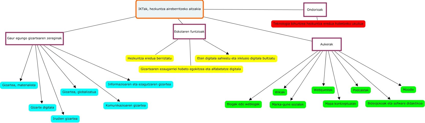 This Concept Map has information related to: Ibon Romero, IKTak, hezkuntza aireberritzeko aitzakia Gaur egungo gizartearen zereginak Informazioaren eta ezagutzaren gizartea, IKTak, hezkuntza aireberritzeko aitzakia Gaur egungo gizartearen zereginak Irudien gizartea, IKTak, hezkuntza aireberritzeko aitzakia Aukerak Podcastak, IKTak, hezkuntza aireberritzeko aitzakia Gaur egungo gizartearen zereginak Komunikazioaren gizartea, IKTak, hezkuntza aireberritzeko aitzakia Aukerak Wikiak, IKTak, hezkuntza aireberritzeko aitzakia Aukerak Webquestak, IKTak, hezkuntza aireberritzeko aitzakia Gaur egungo gizartearen zereginak Gizarte digitala, IKTak, hezkuntza aireberritzeko aitzakia Eskolaren funtzioak Hezkuntza eredua berriztatu, IKTak, hezkuntza aireberritzeko aitzakia Eskolaren funtzioak Eten digitala sahiestu eta inklusio digitala bultzatu, IKTak, hezkuntza aireberritzeko aitzakia Aukerak Mapa kontzeptualak