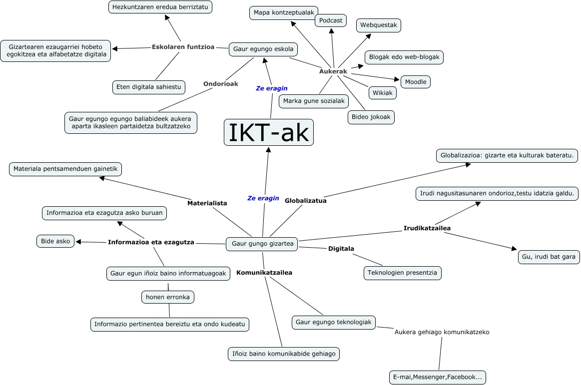 This Concept Map has information related to: maialen delgado map, Gaur gungo gizartea Irudikatzailea Irudi nagusitasunaren ondorioz,testu idatzia galdu., Gaur egungo eskola Eskolaren funtzioa Gizartearen ezaugarriei hobeto egokitzea eta alfabetatze digitala, Gaur egungo eskola Aukerak Webquestak, Gaur egungo eskola Eskolaren funtzioa Eten digitala sahiestu, Gaur gungo gizartea Komunikatzailea Gaur egungo teknologiak, Gaur gungo gizartea Globalizatua Globalizazioa: gizarte eta kulturak bateratu., Gaur gungo gizartea Informazioa eta ezagutza Gaur egun iñoiz baino informatuagoak, Gaur egungo eskola Aukerak Moodle, Gaur egungo eskola Aukerak Marka gune sozialak, Gaur egungo eskola Aukerak Blogak edo web-blogak