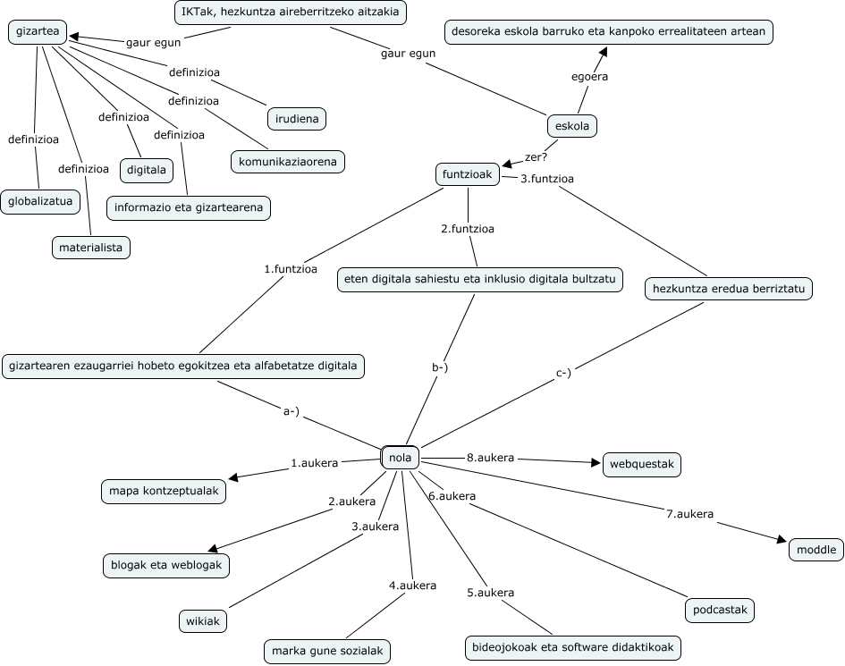 This Concept Map, created with IHMC CmapTools, has information related to: NB,MN, IKTak, hezkuntza aireberritzeko aitzakia gaur egun gizartea, nola 2.aukera blogak eta weblogak, nola 1.aukera mapa kontzeptualak, funtzioak 3.funtzioa hezkuntza eredua berriztatu, nola 8.aukera webquestak, eskola zer? funtzioak, gizartea definizioa informazio eta gizartearena, gizartearen ezaugarriei hobeto egokitzea eta alfabetatze digitala a-) nola, eten digitala sahiestu eta inklusio digitala bultzatu b-) ????, IKTak, hezkuntza aireberritzeko aitzakia gaur egun eskola, nola 3.aukera wikiak, nola 6.aukera podcastak, gizartea definizioa komunikaziaorena, gizartea definizioa globalizatua, funtzioak 2.funtzioa eten digitala sahiestu eta inklusio digitala bultzatu, hezkuntza eredua berriztatu c-) nola, gizartea definizioa irudiena, gizartea definizioa digitala, eskola egoera desoreka eskola barruko eta kanpoko errealitateen artean, funtzioak 1.funtzioa gizartearen ezaugarriei hobeto egokitzea eta alfabetatze digitala