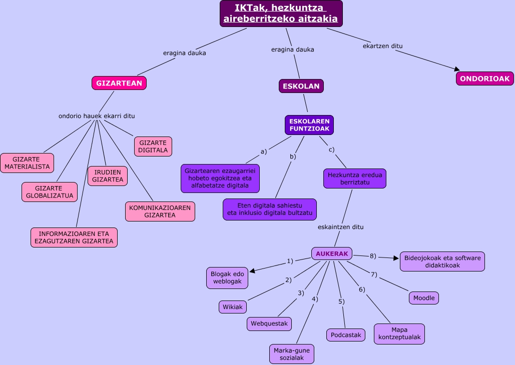 This Concept Map, created with IHMC CmapTools, has information related to: Miiram Azpeitia (Mapa kontzeptuala IKT), GIZARTEAN ondorio hauek ekarri ditu GIZARTE DIGITALA, AUKERAK 5) Podcastak, AUKERAK 2) Wikiak, IKTak, hezkuntza aireberritzeko aitzakia eragina dauka ESKOLAN, AUKERAK 7) Moodle, IKTak, hezkuntza aireberritzeko aitzakia eragina dauka GIZARTEAN, AUKERAK 3) Webquestak, GIZARTEAN ondorio hauek ekarri ditu IRUDIEN GIZARTEA, AUKERAK 4) Marka-gune sozialak, ESKOLAN ESKOLAREN FUNTZIOAK, ESKOLAREN FUNTZIOAK b) Eten digitala sahiestu eta inklusio digitala bultzatu, GIZARTEAN ondorio hauek ekarri ditu GIZARTE GLOBALIZATUA, GIZARTEAN ondorio hauek ekarri ditu GIZARTE MATERIALISTA, Hezkuntza eredua berriztatu eskaintzen ditu AUKERAK, AUKERAK 6) Mapa kontzeptualak, AUKERAK 8) Bideojokoak eta software didaktikoak, GIZARTEAN ondorio hauek ekarri ditu INFORMAZIOAREN ETA EZAGUTZAREN GIZARTEA, AUKERAK 1) Blogak edo weblogak, ESKOLAREN FUNTZIOAK a) Gizartearen ezaugarriei hobeto egokitzea eta alfabetatze digitala, IKTak, hezkuntza aireberritzeko aitzakia ekartzen ditu ONDORIOAK