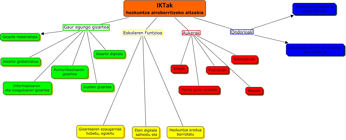 This Concept Map has information related to: Irune Perugorria, IKTak hezkuntza aireberritzeko aitzakia Eskolaren Funtzioa Gizartearen ezaugarriak hobetu, egokitu, IKTak hezkuntza aireberritzeko aitzakia Gaur egungo gizartea Gizarte globalizatua, IKTak hezkuntza aireberritzeko aitzakia Gaur egungo gizartea Gizarte materialista, IKTak hezkuntza aireberritzeko aitzakia Ondorioak Irakasleak jarrera arduratsua izan behar du, IKTak hezkuntza aireberritzeko aitzakia Gaur egungo gizartea Informazioaren eta ezagutzaren gizartea, IKTak hezkuntza aireberritzeko aitzakia Ondorioak Teknologia hezkuntza eredu bihurtu, IKTak hezkuntza aireberritzeko aitzakia Eskolaren Funtzioa Eten digitala saihestu eta, IKTak hezkuntza aireberritzeko aitzakia Gaur egungo gizartea Irudien gizartea, IKTak hezkuntza aireberritzeko aitzakia Aukerak Marka gune sozialak, IKTak hezkuntza aireberritzeko aitzakia Aukerak Bideojokoak