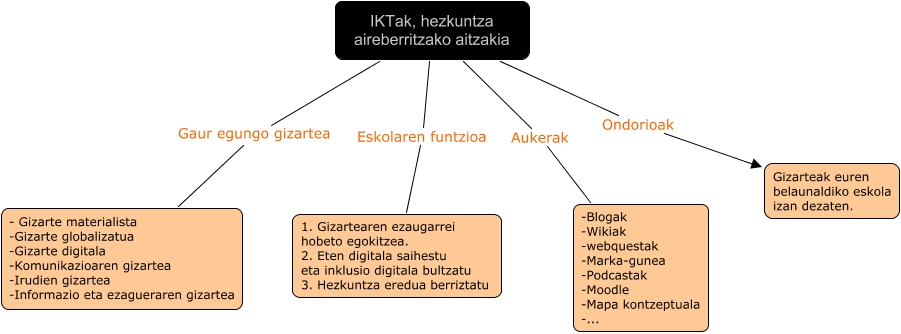 This Concept Map has information related to: Eli Rodriguez, IKTak, hezkuntza aireberritzako aitzakia Eskolaren funtzioa 1. Gizartearen ezaugarrei hobeto egokitzea. 2. Eten digitala saihestu eta inklusio digitala bultzatu 3. Hezkuntza eredua berriztatu, IKTak, hezkuntza aireberritzako aitzakia Ondorioak Gizarteak euren belaunaldiko eskola izan dezaten., IKTak, hezkuntza aireberritzako aitzakia Aukerak -Blogak -Wikiak -webquestak -Marka-gunea -Podcastak -Moodle -Mapa kontzeptuala -..., IKTak, hezkuntza aireberritzako aitzakia Gaur egungo gizartea - Gizarte materialista -Gizarte globalizatua -Gizarte digitala -Komunikazioaren gizartea -Irudien gizartea -Informazio eta ezagueraren gizartea