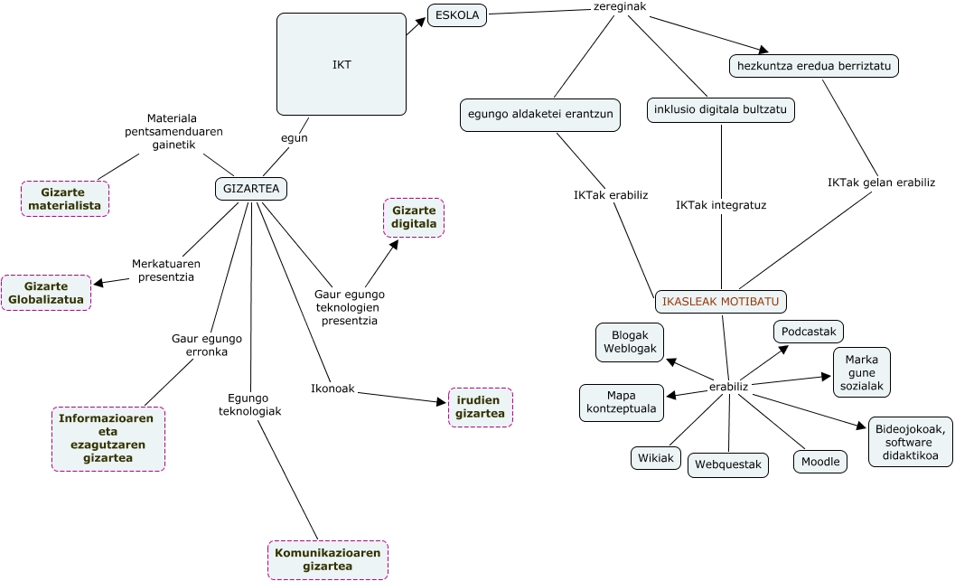 This Concept Map, created with IHMC CmapTools, has information related to: Erika Lujambio, GIZARTEA Ikonoak irudien gizartea, IKASLEAK MOTIBATU erabiliz Webquestak, GIZARTEA Gaur egungo erronka Informazioaren eta ezagutzaren gizartea, IKASLEAK MOTIBATU erabiliz Wikiak, IKT egun GIZARTEA, GIZARTEA Gaur egungo teknologien presentzia Gizarte digitala, IKASLEAK MOTIBATU erabiliz Podcastak, hezkuntza eredua berriztatu IKTak gelan erabiliz IKASLEAK MOTIBATU, GIZARTEA Materiala pentsamenduaren gainetik Gizarte materialista, IKASLEAK MOTIBATU erabiliz Moodle, ESKOLA zereginak egungo aldaketei erantzun, ESKOLA zereginak inklusio digitala bultzatu, IKASLEAK MOTIBATU erabiliz Bideojokoak, software didaktikoa, inklusio digitala bultzatu IKTak integratuz IKASLEAK MOTIBATU, GIZARTEA Egungo teknologiak Komunikazioaren gizartea, GIZARTEA Merkatuaren presentzia Gizarte Globalizatua, IKASLEAK MOTIBATU erabiliz Marka gune sozialak, IKASLEAK MOTIBATU erabiliz Mapa kontzeptuala, IKASLEAK MOTIBATU erabiliz Blogak Weblogak, IKT ???? ESKOLA
