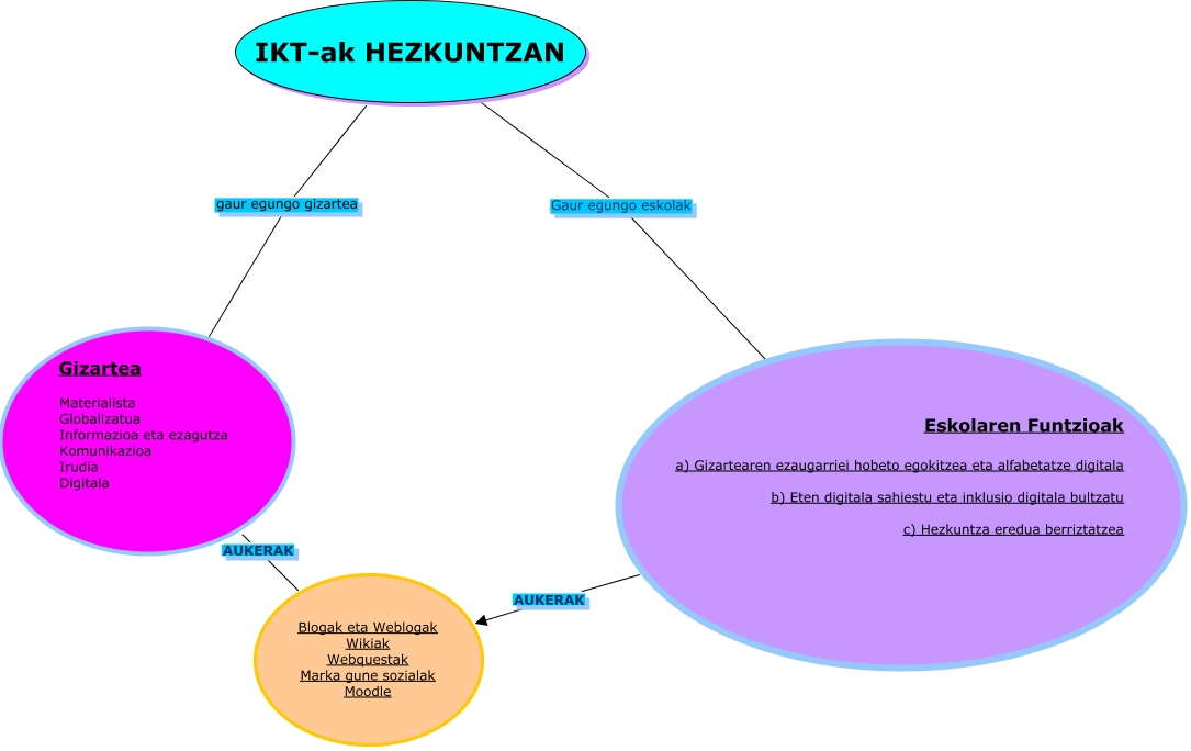 This Concept Map has information related to: Bego Vazquez, IKT-ak HEZKUNTZAN gaur egungo gizartea Gizartea Materialista Globalizatua Informazioa eta ezagutza Komunikazioa Irudia Digitala, Eskolaren Funtzioak a) Gizartearen ezaugarriei hobeto egokitzea eta alfabetatze digitala b) Eten digitala sahiestu eta inklusio digitala bultzatu c) Hezkuntza eredua berriztatzea AUKERAK Blogak eta Weblogak Wikiak Webquestak Marka gune sozialak Moodle, IKT-ak HEZKUNTZAN Gaur egungo eskolak Eskolaren Funtzioak a) Gizartearen ezaugarriei hobeto egokitzea eta alfabetatze digitala b) Eten digitala sahiestu eta inklusio digitala bultzatu c) Hezkuntza eredua berriztatzea, Gizartea Materialista Globalizatua Informazioa eta ezagutza Komunikazioa Irudia Digitala AUKERAK Blogak eta Weblogak Wikiak Webquestak Marka gune sozialak Moodle