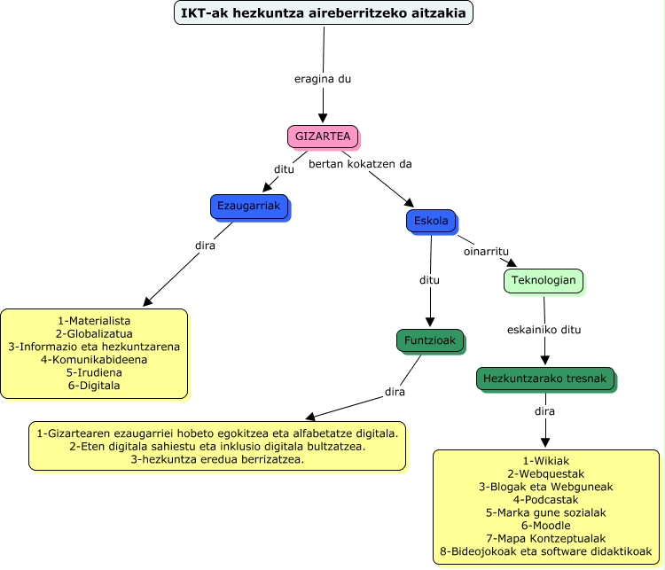 This Concept Map has information related to: nora miguez, Ezaugarriak dira 1-Materialista 2-Globalizatua 3-Informazio eta hezkuntzarena 4-Komunikabideena 5-Irudiena 6-Digitala, IKT-ak hezkuntza aireberritzeko aitzakia eragina du GIZARTEA, Eskola oinarritu Teknologian, Hezkuntzarako tresnak dira 1-Wikiak 2-Webquestak 3-Blogak eta Webguneak 4-Podcastak 5-Marka gune sozialak 6-Moodle 7-Mapa Kontzeptualak 8-Bideojokoak eta software didaktikoak, Funtzioak dira 1-Gizartearen ezaugarriei hobeto egokitzea eta alfabetatze digitala. 2-Eten digitala sahiestu eta inklusio digitala bultzatzea. 3-hezkuntza eredua berrizatzea., GIZARTEA ditu Ezaugarriak, Teknologian eskainiko ditu Hezkuntzarako tresnak, GIZARTEA bertan kokatzen da Eskola, Eskola ditu Funtzioak