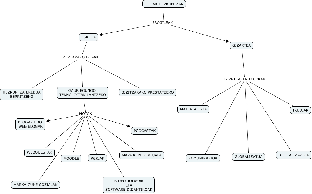 This Concept Map has information related to: ASIER MUGARTEGI, GAUR EGUNGO TEKNOLOGIAK LANTZEKO MOTAK PODCASTAK, GAUR EGUNGO TEKNOLOGIAK LANTZEKO MOTAK MOODLE, ESKOLA ZERTARAKO IKT-AK GAUR EGUNGO TEKNOLOGIAK LANTZEKO, IKT-AK HEZKUNTZAN ERAGILEAK ESKOLA, ESKOLA ZERTARAKO IKT-AK BIZITZARAKO PRESTATZEKO, ESKOLA ZERTARAKO IKT-AK HEZKUNTZA EREDUA BERRITZEKO, GIZARTEA GIZRTEAREN IKURRAK MATERIALISTA, GAUR EGUNGO TEKNOLOGIAK LANTZEKO MOTAK MARKA GUNE SOZIALAK, GIZARTEA GIZRTEAREN IKURRAK DIGITALIZAZIOA, GAUR EGUNGO TEKNOLOGIAK LANTZEKO MOTAK WIKIAK