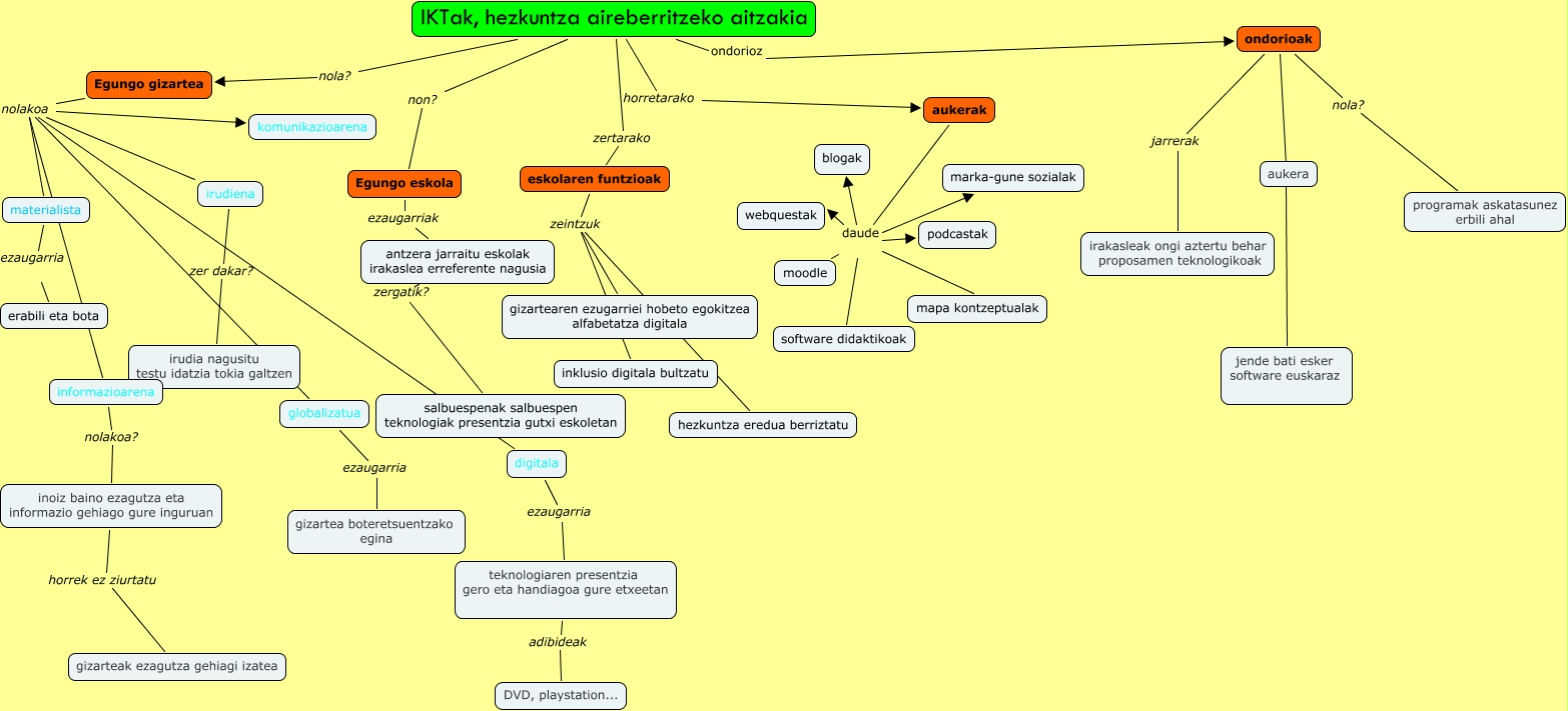 This Concept Map has information related to: Mikel Arosa, eskolaren funtzioak zeintzuk hezkuntza eredua berriztatu, Egungo gizartea nolakoa digitala, IKTak, hezkuntza aireberritzeko aitzakia horretarako aukerak, aukerak daude webquestak, IKTak, hezkuntza aireberritzeko aitzakia non? Egungo eskola, materialista ezaugarria erabili eta bota, globalizatua ezaugarria gizartea boteretsuentzako egina, antzera jarraitu eskolak irakaslea erreferente nagusia zergatik? salbuespenak salbuespen teknologiak presentzia gutxi eskoletan, ondorioak jarrerak irakasleak ongi aztertu behar proposamen teknologikoak, Egungo gizartea nolakoa globalizatua