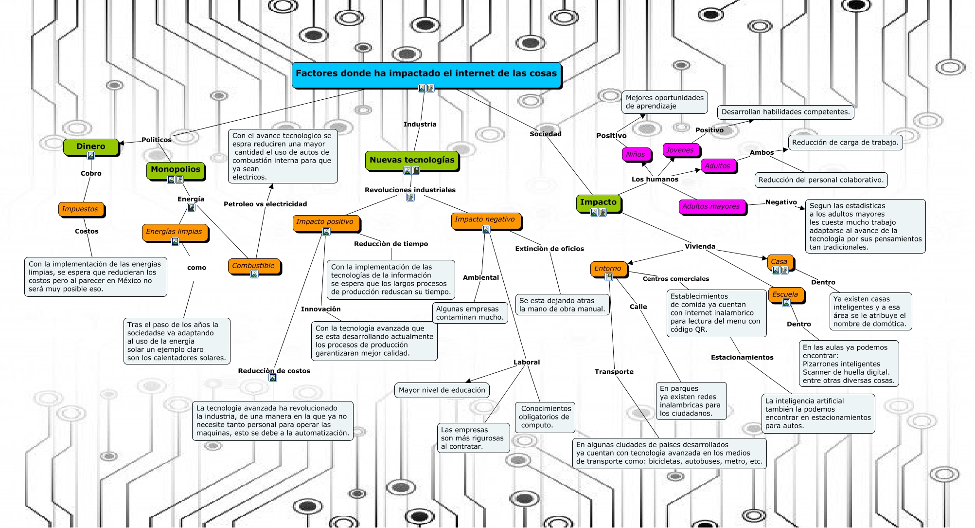 Este Cmap, tiene información relacionada con: seikote, Adultos mayores Negativo Segun las estadisticas a los adultos mayores les cuesta mucho trabajo adaptarse al avance de la tecnología por sus pensamientos tan tradicionales., Factores donde ha impactado el internet de las cosas Politicos Monopolios, Adultos Ambos Reducción del personal colaborativo., Nuevas tecnologías Revoluciones industriales Impacto positivo, Impacto Vivienda Casa, Monopolios Energía Energías limpias, Impacto Los humanos Adultos mayores, Energías limpias como Tras el paso de los años la sociedadse va adaptando al uso de la energía solar un ejemplo claro son los calentadores solares., Entorno Centros comerciales Establecimientos de comida ya cuentan con internet inalambrico para lectura del menu con código QR., Establecimientos de comida ya cuentan con internet inalambrico para lectura del menu con código QR. Estacionamientos La inteligencia artificial también la podemos encontrar en estacionamientos para autos., Casa Dentro Ya existen casas inteligentes y a esa área se le atribuye el nombre de domótica., Nuevas tecnologías Revoluciones industriales Impacto negativo, Impacto negativo Extinción de oficios Se esta dejando atras la mano de obra manual., Impacto positivo Reducción de costos La tecnología avanzada ha revolucionado la industria, de una manera en la que ya no necesite tanto personal para operar las maquinas, esto se debe a la automatización., Impacto Los humanos Adultos, Impuestos Costos Con la implementación de las energías limpias, se espera que reducieran los costos pero al parecer en México no será muy posible eso., Escuela Dentro En las aulas ya podemos encontrar: Pizarrones inteligentes Scanner de huella digital. entre otras diversas cosas., Entorno Transporte En algunas ciudades de paises desarrollados ya cuentan con tecnología avanzada en los medios de transporte como: bicicletas, autobuses, metro, etc., Impacto positivo Innovación Con la tecnología avanzada que se esta desarrollando actualmente los procesos de producción garantizaran mejor calidad., Jovenes Positivo Desarrollan habilidades competentes.