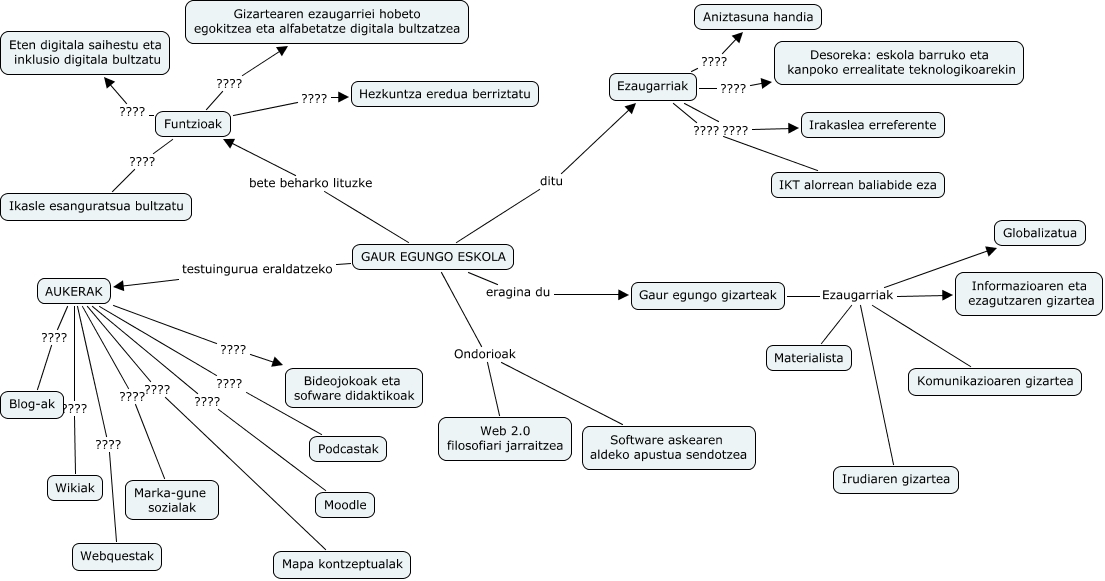 This Concept Map has information related to: Itsaso Pagoaga, Funtzioak ???? Gizartearen ezaugarriei hobeto egokitzea eta alfabetatze digitala bultzatzea, AUKERAK ???? Moodle, GAUR EGUNGO ESKOLA testuingurua eraldatzeko AUKERAK, Funtzioak ???? Hezkuntza eredua berriztatu, Gaur egungo gizarteak Ezaugarriak Informazioaren eta ezagutzaren gizartea, Funtzioak ???? Eten digitala saihestu eta inklusio digitala bultzatu, AUKERAK ???? Blog-ak, AUKERAK ???? Marka-gune sozialak, GAUR EGUNGO ESKOLA Ondorioak Web 2.0 filosofiari jarraitzea, Ezaugarriak ???? Desoreka: eskola barruko eta kanpoko errealitate teknologikoarekin