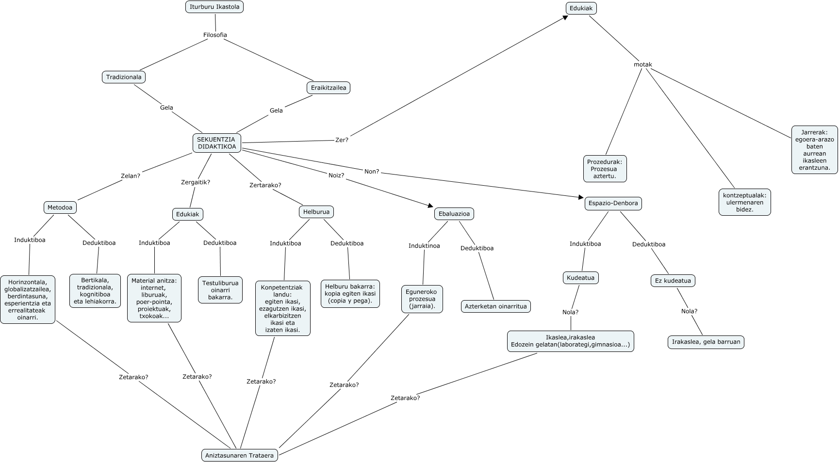 This Concept Map has information related to: koi eskema, Tradizionala Gela SEKUENTZIA DIDAKTIKOA, SEKUENTZIA DIDAKTIKOA Zergaitik? Edukiak, Edukiak motak Jarrerak: egoera-arazo baten aurrean ikasleen erantzuna., SEKUENTZIA DIDAKTIKOA Zelan? Metodoa, Helburua Deduktiboa Helburu bakarra: kopia egiten ikasi (copia y pega)., Ebaluazioa Induktinoa Eguneroko prozesua (jarraia)., Espazio-Denbora Deduktiboa Ez kudeatua, Edukiak Induktiboa Material anitza: internet, liburuak, poer-pointa, proiektuak, txokoak..., SEKUENTZIA DIDAKTIKOA Zertarako? Helburua, SEKUENTZIA DIDAKTIKOA Non? Espazio-Denbora