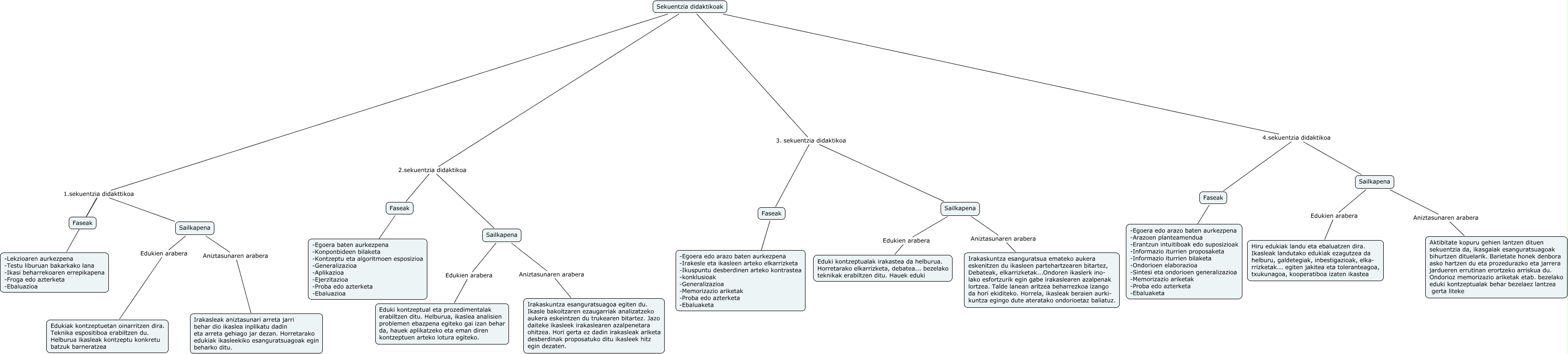 Este mapa conceptual tiene información relacionada a: mikel, garmendia, Sekuentzia didaktikoak 3. sekuentzia didaktikoa Sailkapena, Sekuentzia didaktikoak 1.sekuentzia didakttikoa Sailkapena, Sailkapena Aniztasunaren arabera Irakaskuntza esanguratsuagoa egiten du. Ikasle bakoitzaren ezaugarriak analizatzeko aukera eskeintzen du trukearen bitartez. Jazo daiteke ikasleek irakaslearen azalpenetara ohitzea. Hori gerta ez dadin irakasleak ariketa desberdinak proposatuko ditu ikasleek hitz egin dezaten., Sekuentzia didaktikoak 3. sekuentzia didaktikoa Faseak, Sailkapena Edukien arabera Hiru edukiak landu eta ebaluatzen dira. Ikasleak landutako edukiak ezagutzea da helburu, galdetegiak, inbestigazioak, elka- rrizketak... egiten jakitea eta toleranteagoa, txukunagoa, kooperatiboa izaten ikastea, Sailkapena Aniztasunaren arabera Aktibitate kopuru gehien lantzen dituen sekuentzia da, ikasgaiak esanguratsuagoak bihurtzen dituelarik. Barietate honek denbora asko hartzen du eta prozedurazko eta jarrera jardueren errutinan erortzeko arriskua du. Ondorioz memorizazio ariketak etab. bezelako eduki kontzeptualak behar bezelaez lantzea gerta liteke, Sailkapena Aniztasunaren arabera Irakasleak aniztasunari arreta jarri behar dio ikaslea inplikatu dadin eta arreta gehiago jar dezan. Horretarako edukiak ikasleekiko esanguratsuagoak egin beharko ditu., Sailkapena Edukien arabera Eduki kontzeptual eta prozedimentalak erabiltzen ditu. Helburua, ikaslea analisien problemen ebazpena egiteko gai izan behar da, hauek aplikatzeko eta eman diren kontzeptuen arteko lotura egiteko., Faseak ???? -Egoera baten aurkezpena -Konponbideen bilaketa -Kontzeptu eta algoritmoen esposizioa -Generalizazioa -Aplikazioa -Ejerzitazioa -Proba edo azterketa -Ebaluazioa, Sekuentzia didaktikoak 1.sekuentzia didakttikoa Faseak