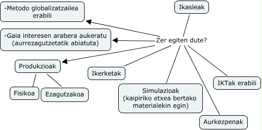 This Concept Map has information related to: Izenik gabe 1, Ikasleak Zer egiten dute? Aurkezpenak, Ikasleak Zer egiten dute? Produkzioak, Ikasleak Zer egiten dute? -Metodo globalizatzailea erabili, Produkzioak ???? Ezagutzakoa, Produkzioak ???? Fisikoa, Ikasleak Zer egiten dute? Ikerketak, Ikasleak Zer egiten dute? Simulazioak (kaipiriko etxea bertako materialekin egin), Ikasleak Zer egiten dute? IKTak erabili, Ikasleak Zer egiten dute? -Gaia interesen arabera aukeratu (aurrezagutzetatik abiatuta)