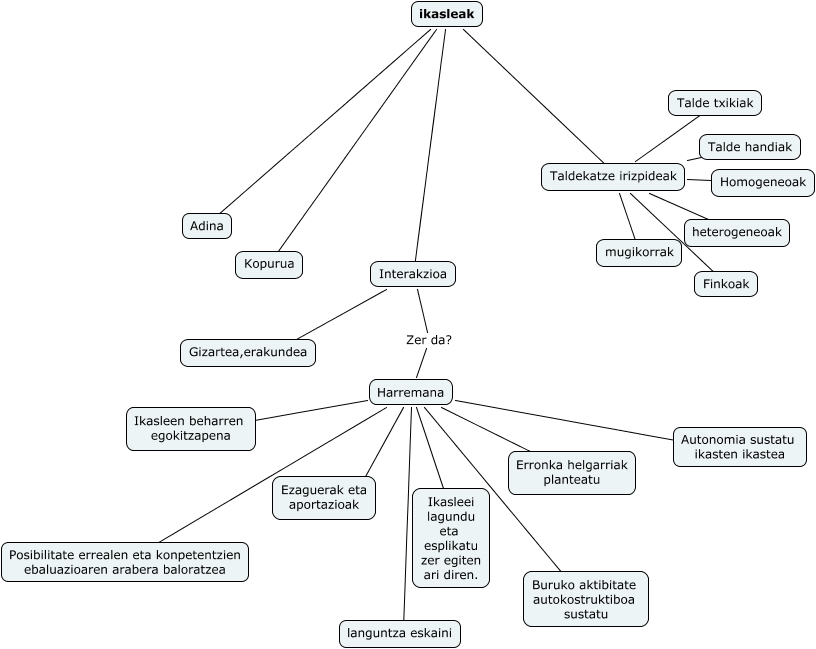 This Concept Map, created with IHMC CmapTools, has information related to: Pocoyo's taldea cmap 4 ikasleak, Harremana ???? Posibilitate errealen eta konpetentzien ebaluazioaren arabera baloratzea, Taldekatze irizpideak ???? Finkoak, Harremana ???? Autonomia sustatu ikasten ikastea, Harremana ???? Ikasleen beharren egokitzapena, Harremana ???? Ikasleei lagundu eta esplikatu zer egiten ari diren., Taldekatze irizpideak ???? Talde handiak, Harremana ???? Erronka helgarriak planteatu, ikasleak ???? Adina, Harremana ???? languntza eskaini, ikasleak ???? Taldekatze irizpideak, Interakzioa Zer da? Harremana, Harremana ???? Buruko aktibitate autokostruktiboa sustatu, ikasleak ???? Interakzioa, ikasleak ???? Kopurua, Harremana ???? Ezaguerak eta aportazioak, Taldekatze irizpideak ???? Homogeneoak, Interakzioa ???? Gizartea,erakundea, Taldekatze irizpideak ???? mugikorrak, Taldekatze irizpideak ???? heterogeneoak, Taldekatze irizpideak ???? Talde txikiak