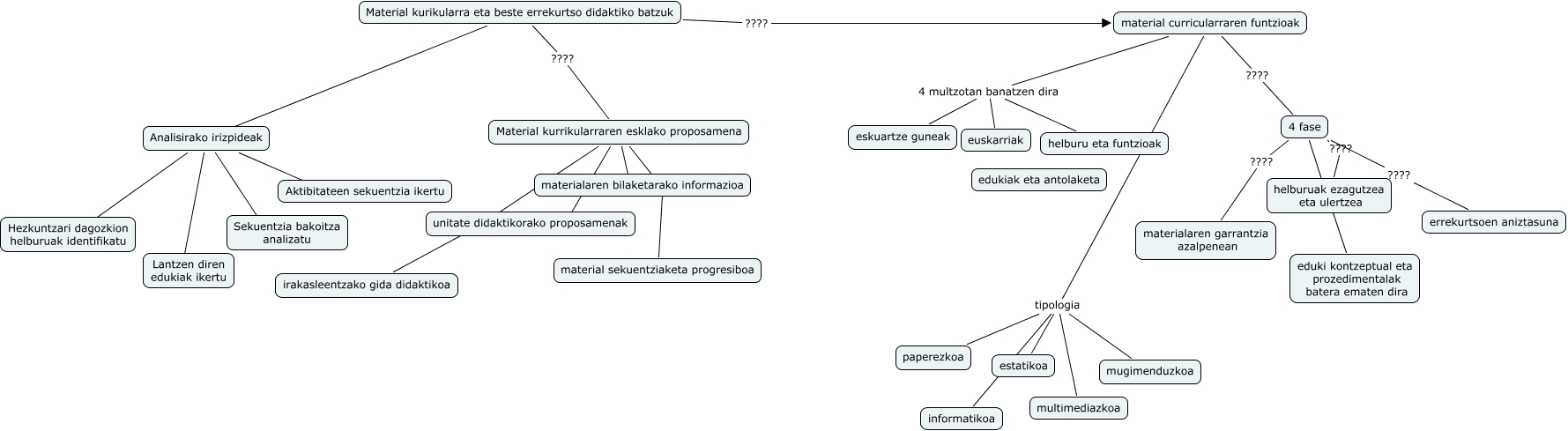 This Concept Map has information related to: Nerea Gil 2, Material kurikularra eta beste errekurtso didaktiko batzuk ???? material curricularraren funtzioak, material curricularraren funtzioak tipologia multimediazkoa, 4 fase ???? eduki kontzeptual eta prozedimentalak batera ematen dira, Analisirako irizpideak ???? Hezkuntzari dagozkion helburuak identifikatu, 4 fase ???? errekurtsoen aniztasuna, material curricularraren funtzioak 4 multzotan banatzen dira eskuartze guneak, Material kurrikularraren esklako proposamena ???? material sekuentziaketa progresiboa, Analisirako irizpideak ???? Lantzen diren edukiak ikertu, Material kurikularra eta beste errekurtso didaktiko batzuk ???? Material kurrikularraren esklako proposamena, material curricularraren funtzioak tipologia paperezkoa